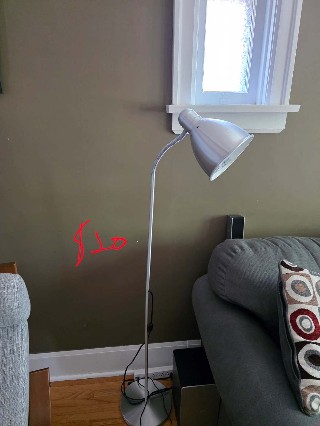 88Adjustable floor lamp. Silver metal finish. Long flexible neck. Good condition. pick up only
