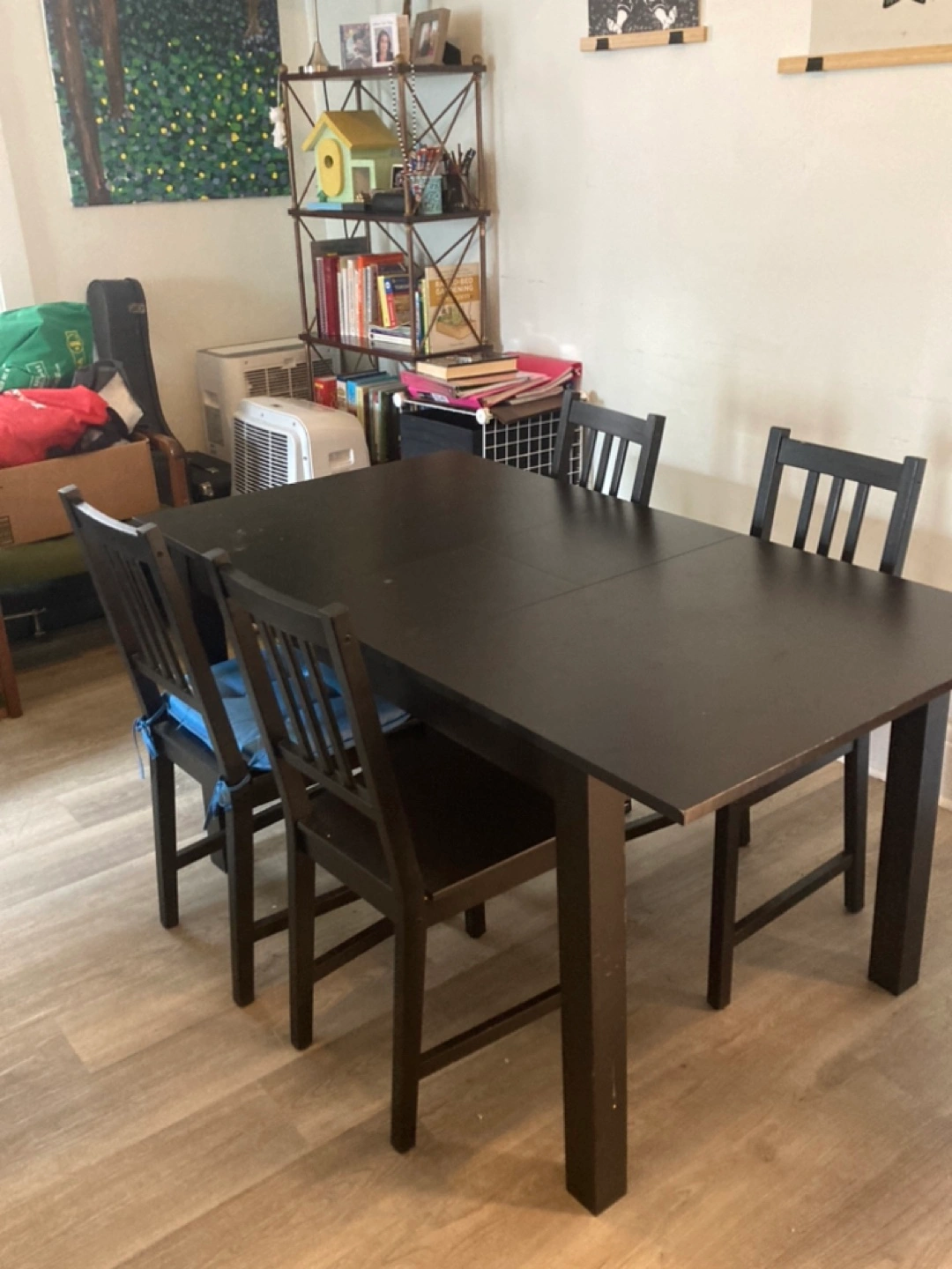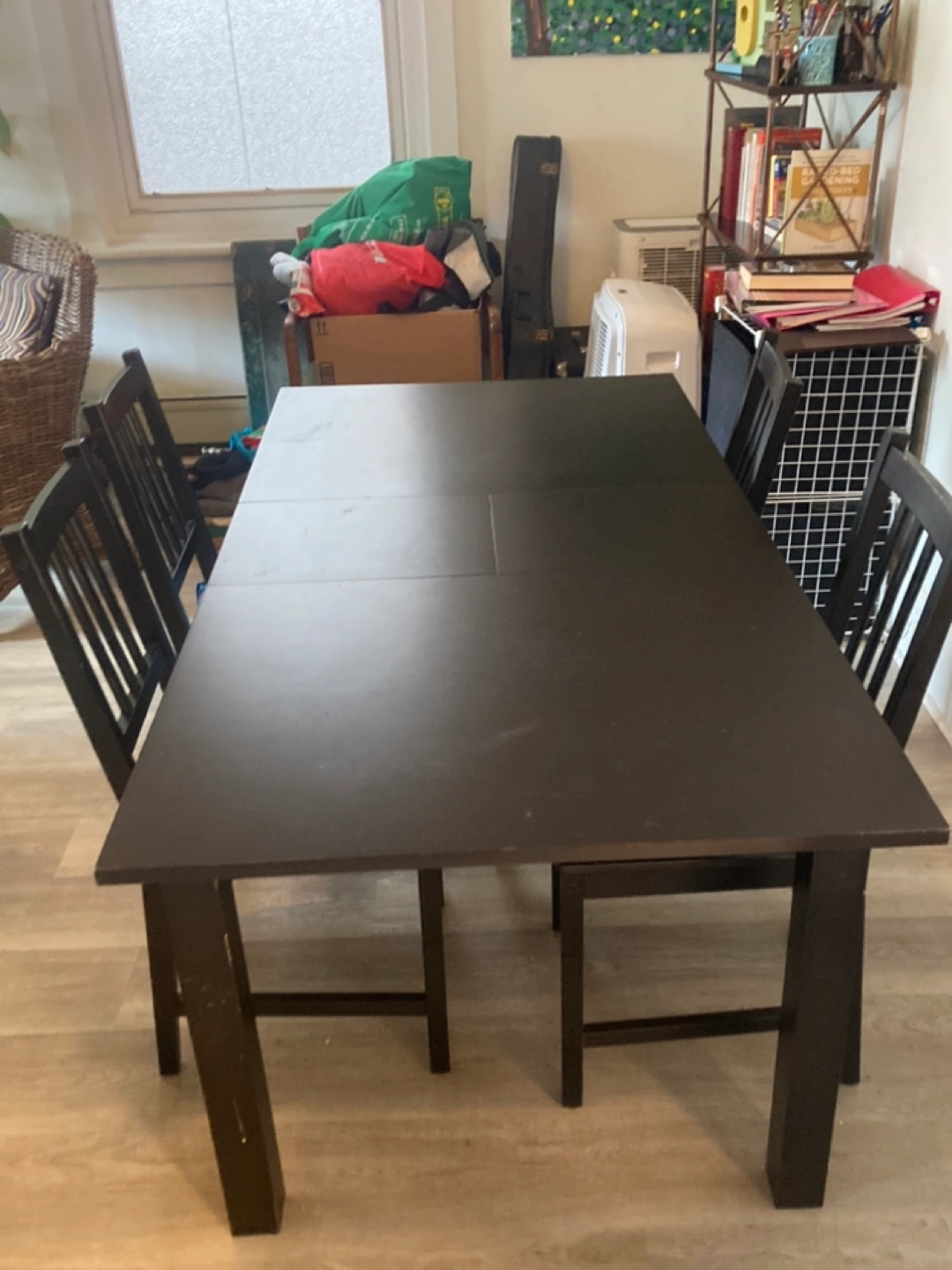 Dark brown extendable dining table. We need to hang onto the chairs for now but could sell them to you later for a good price. Simple design, good for small spaces. Some minor wear. Looking to trade for an armchair!