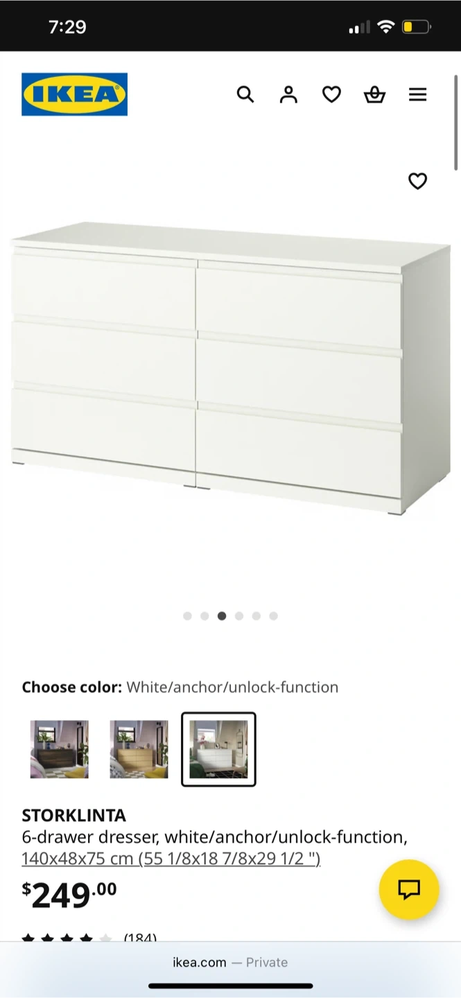 10Selling an IKEA STORKLINTA 6-drawer dresser in white! It's in great shape and ready for a new home. This is an older idea piece ( still in excellent condition) that is made from solid wood not particle board like the newer version of the model, it is very heavy and requires at least 2 men to lift) The dimensions are 140x48x75 cm (55 1/8x18 7/8x29 1/2 "). Originally bought for $250