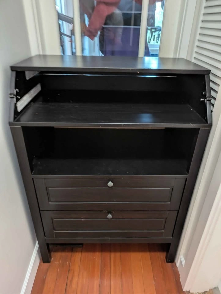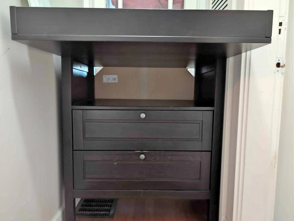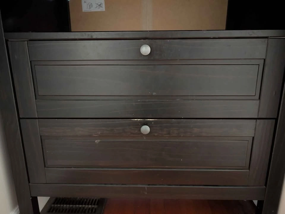 0IKEA SUNDVIK Changing table. Dark brown/black Great versatile piece of furniture that converts from changing table to chest of drawers. Minor scuff on bottom drawer.