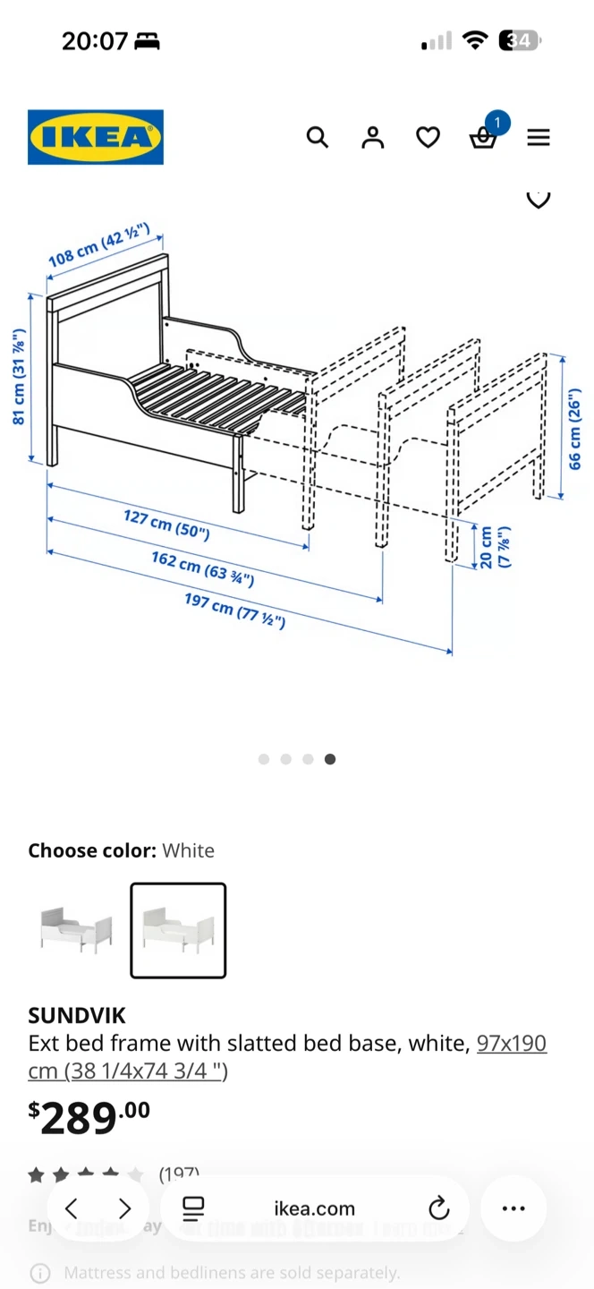 15Selling a white IKEA Sundvik extendable bed frame with a slatted bed base. It's in great shape and ready for a new home! The bed frame is 97x190 cm (38 1/4x74 3/4 "). Originally bought for $289+tax..with mattress included!! Used like new, very good condition, clean nothing wrong with it used few months