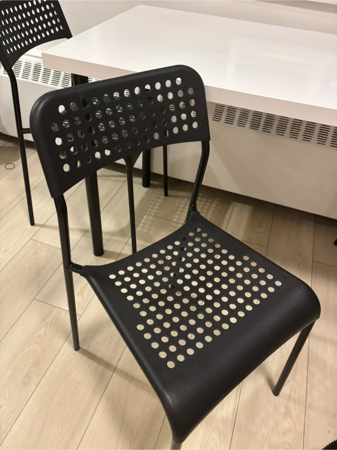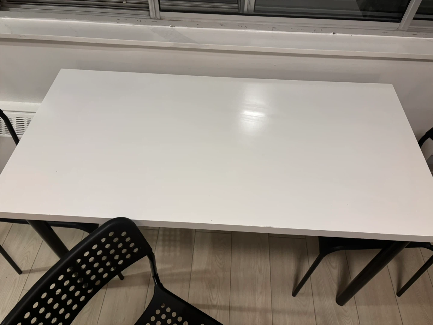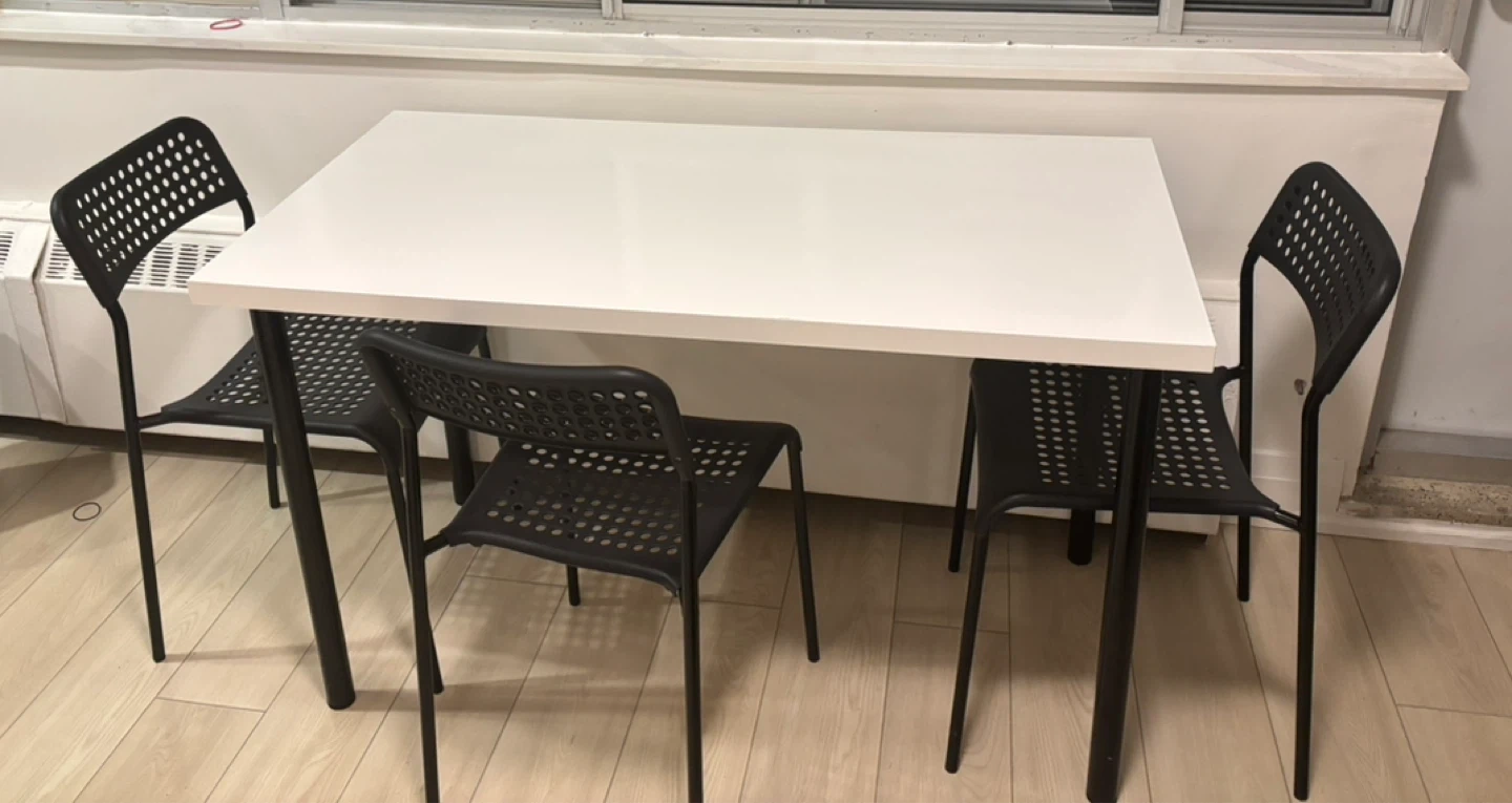MUST GO!!!! clean, modern IKEA dining/utility set. The set includes a IKEA LINNMON / ADILS table with black metal legs and three black stackable IKEA ADDE Chairs. perfect condition Price for all: $70 Chairs: 10$ each Table:50