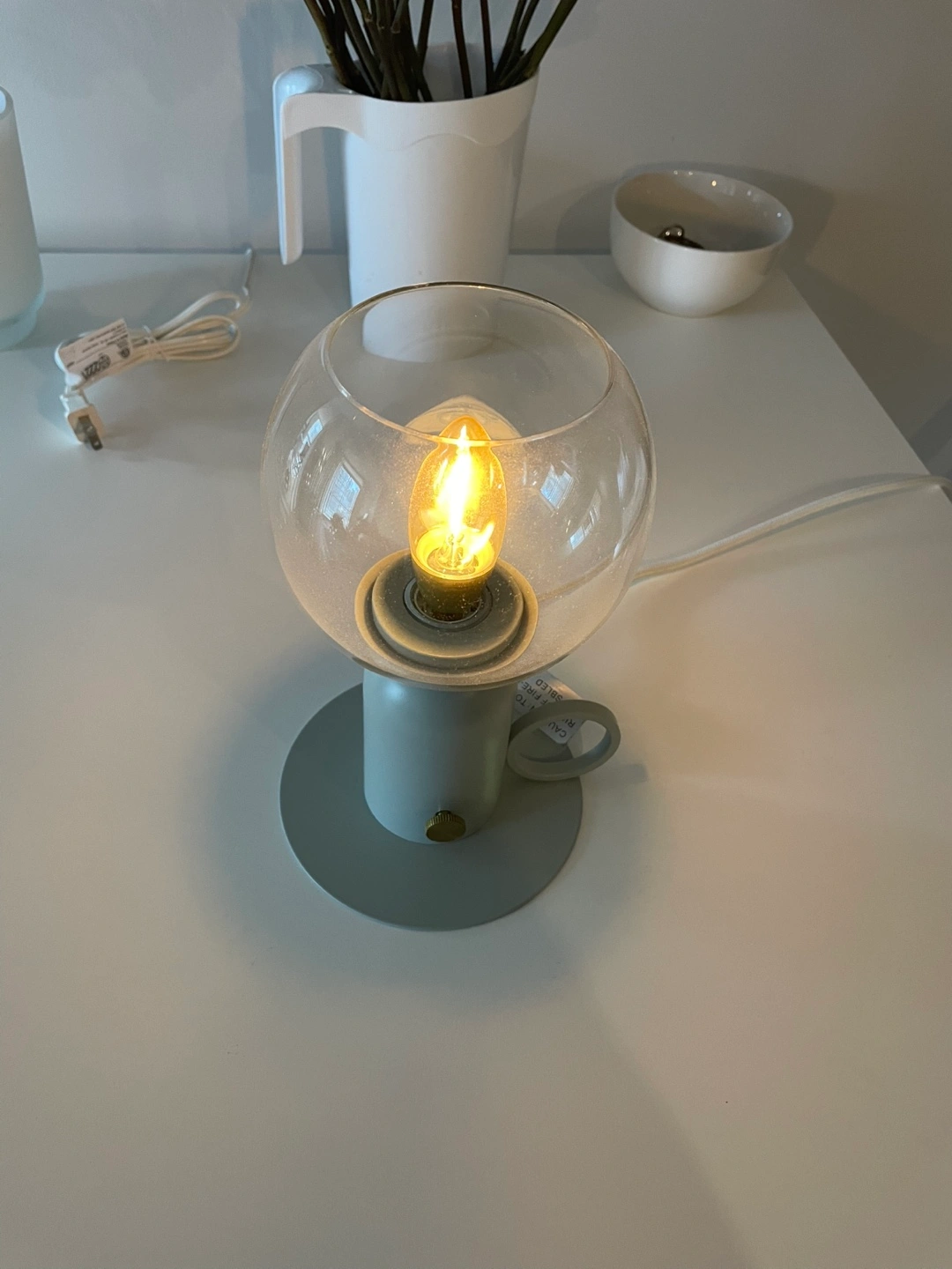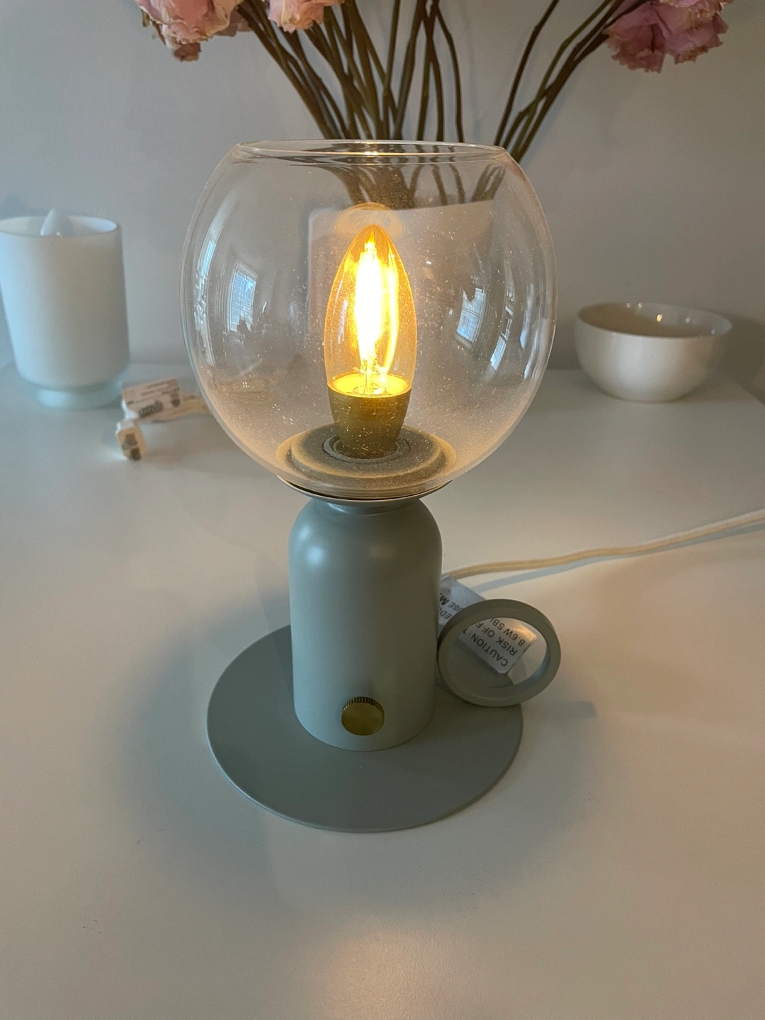 101Table lamp with a glass shade and a grey base. Comes with a lightbulb.