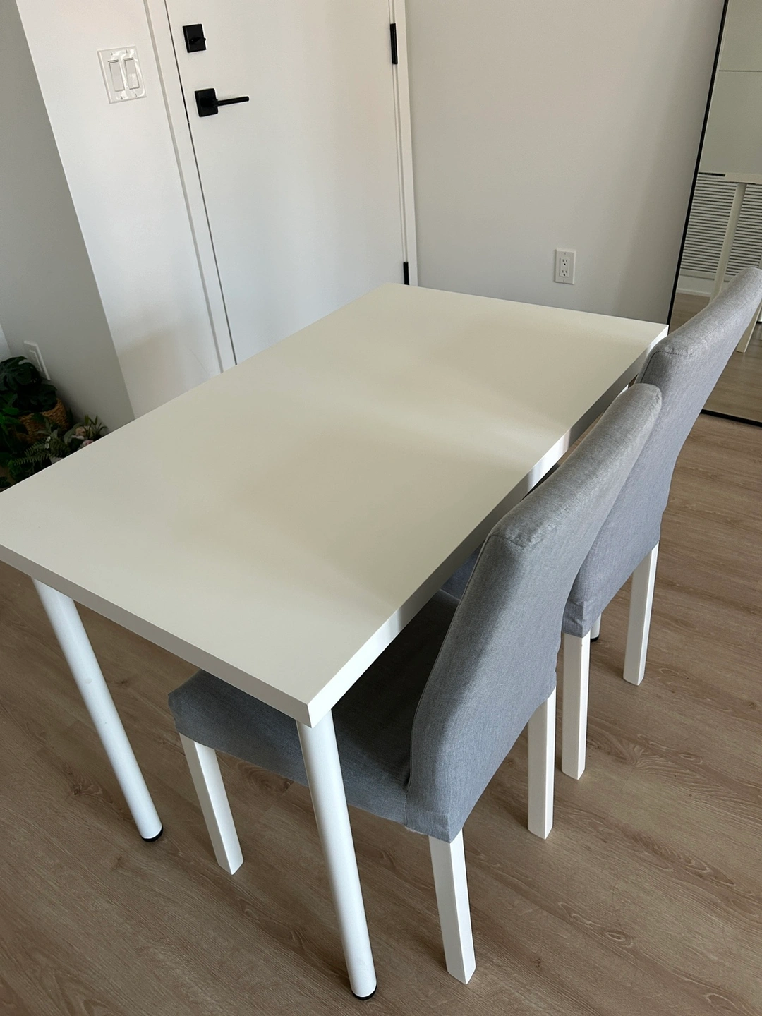 ‼️PICKUP ONLY‼️ Ikea Table and chair set The table can be use as both study/dining table. ⭕️If take the set $150 (offer open) ⭕️If separate $55 ⭕️And two chairs $100 ⭕️Single Chair $55 Measurement is given on the picture Originally bought for Table $70 (LINNMON) Chairs $80 ( KÄTTIL) PICKUP ONLY❗️