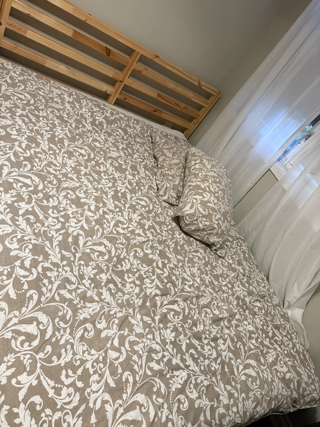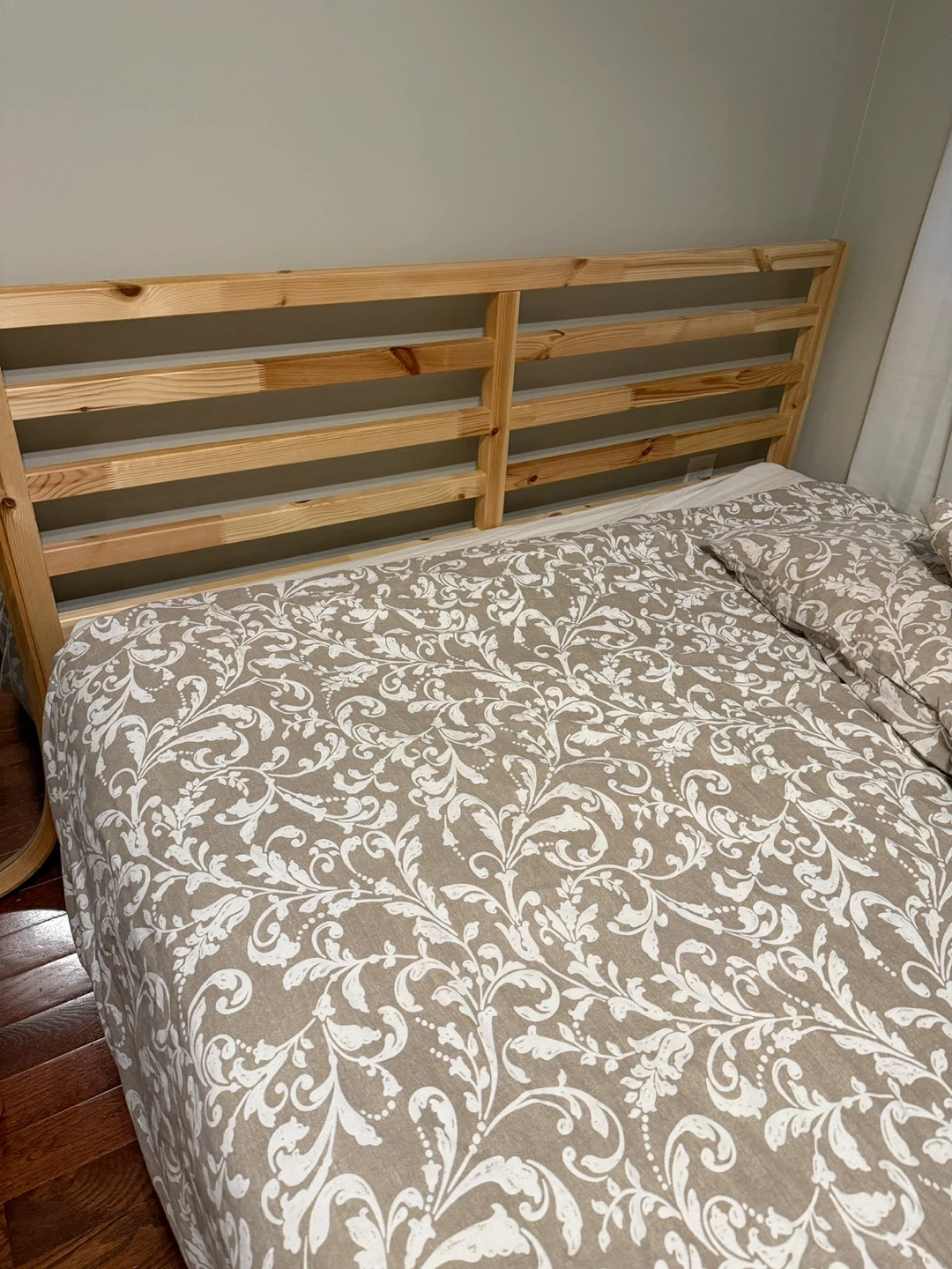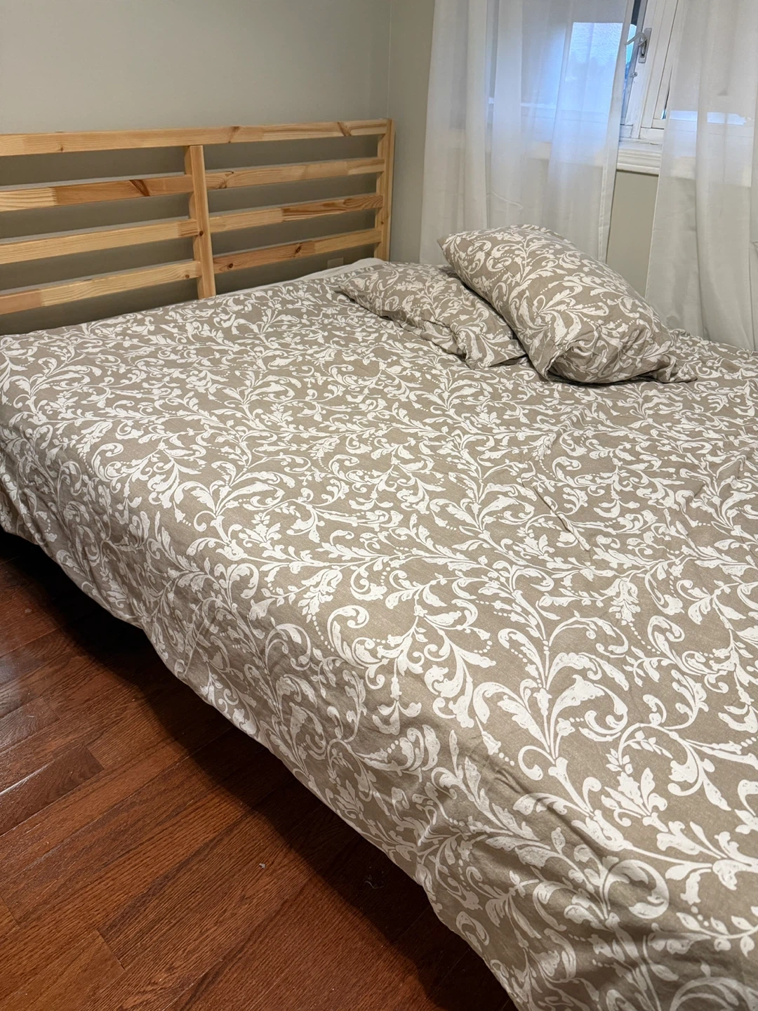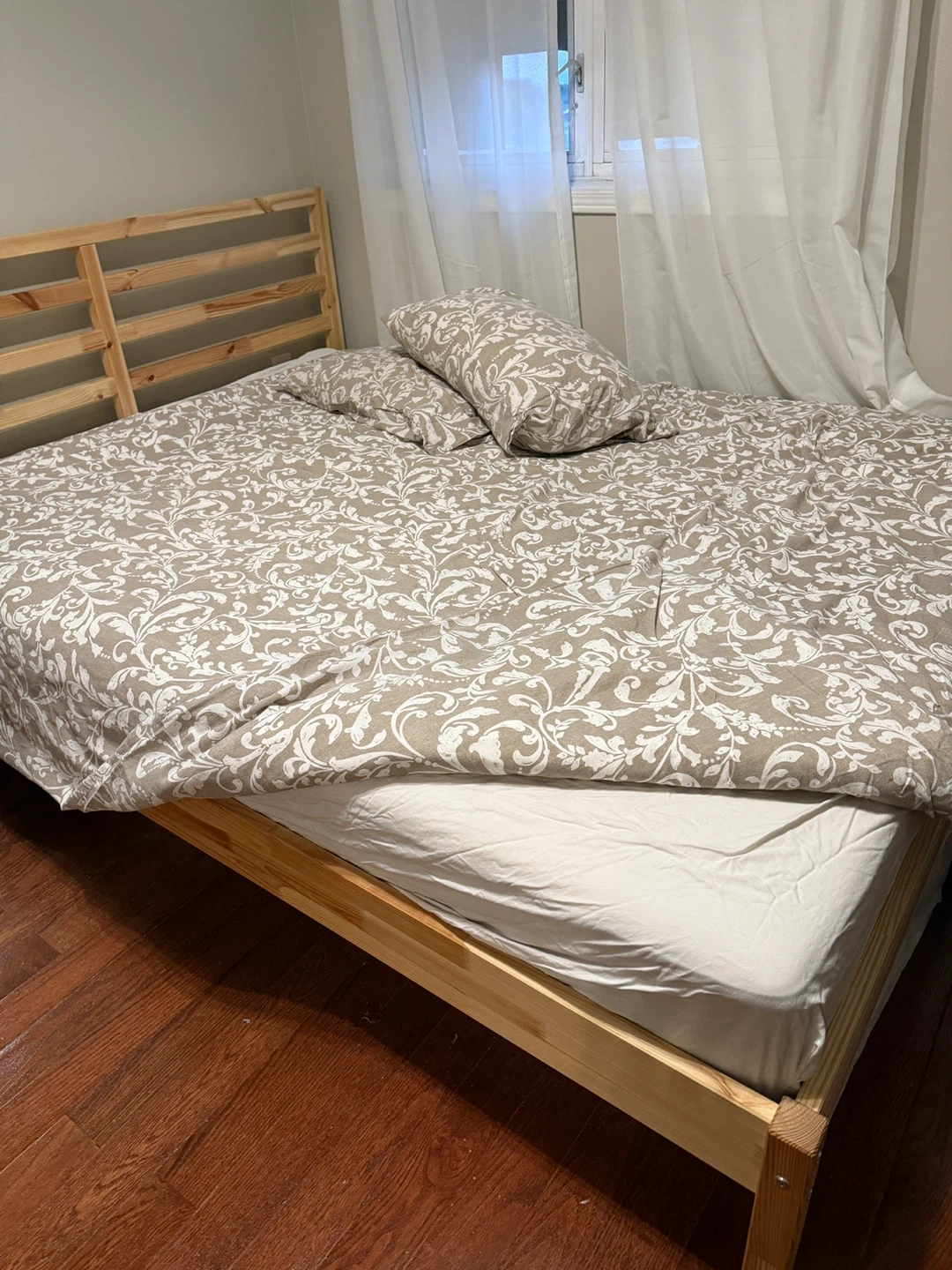 107Selling a full size IKEA TARVA bed frame. It's in great shape and ready for a new home! The frame is a light wood colour and has a simple, minimalist design that would fit well in any bedroom. Perfect for a guest room or a smaller space. Reason for selling - Moving out of country Age - 1 year Material - Solid wood Condition - 9 out of 10 (due to it not being new) Pick-up and cash ONLY. Negotiable within reason.