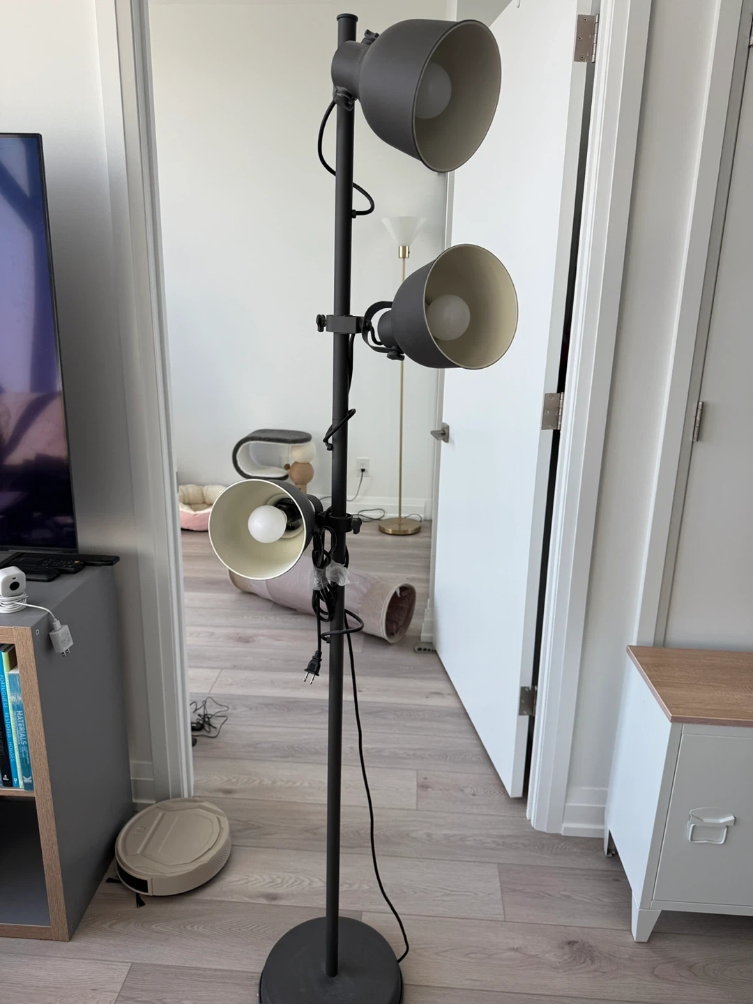 Selling a stylish ikea triple head floor lamp in grey! It's in immaculate condition and would look great in any living space. It has a sturdy base and adjustable heads to direct light where you need it