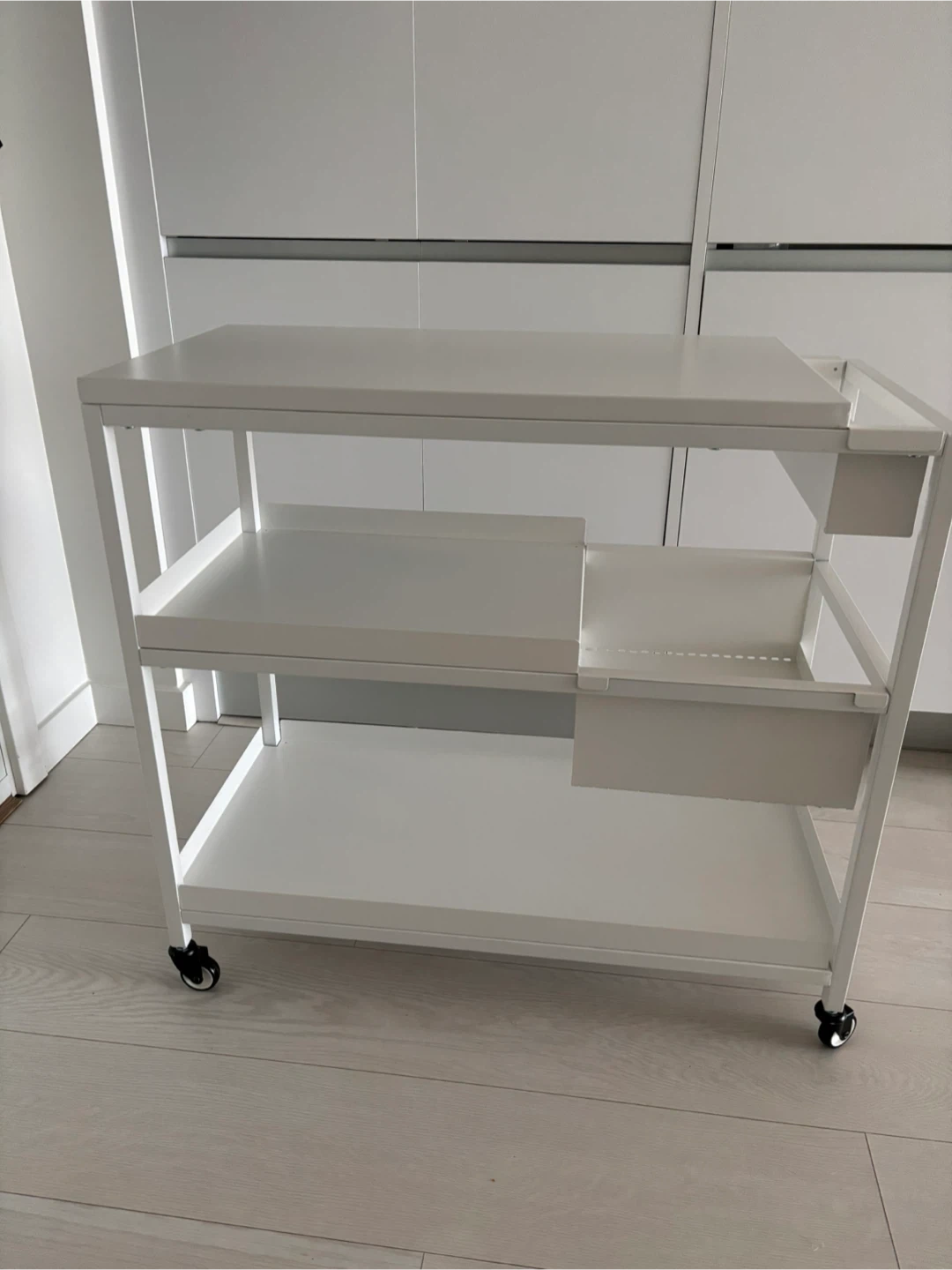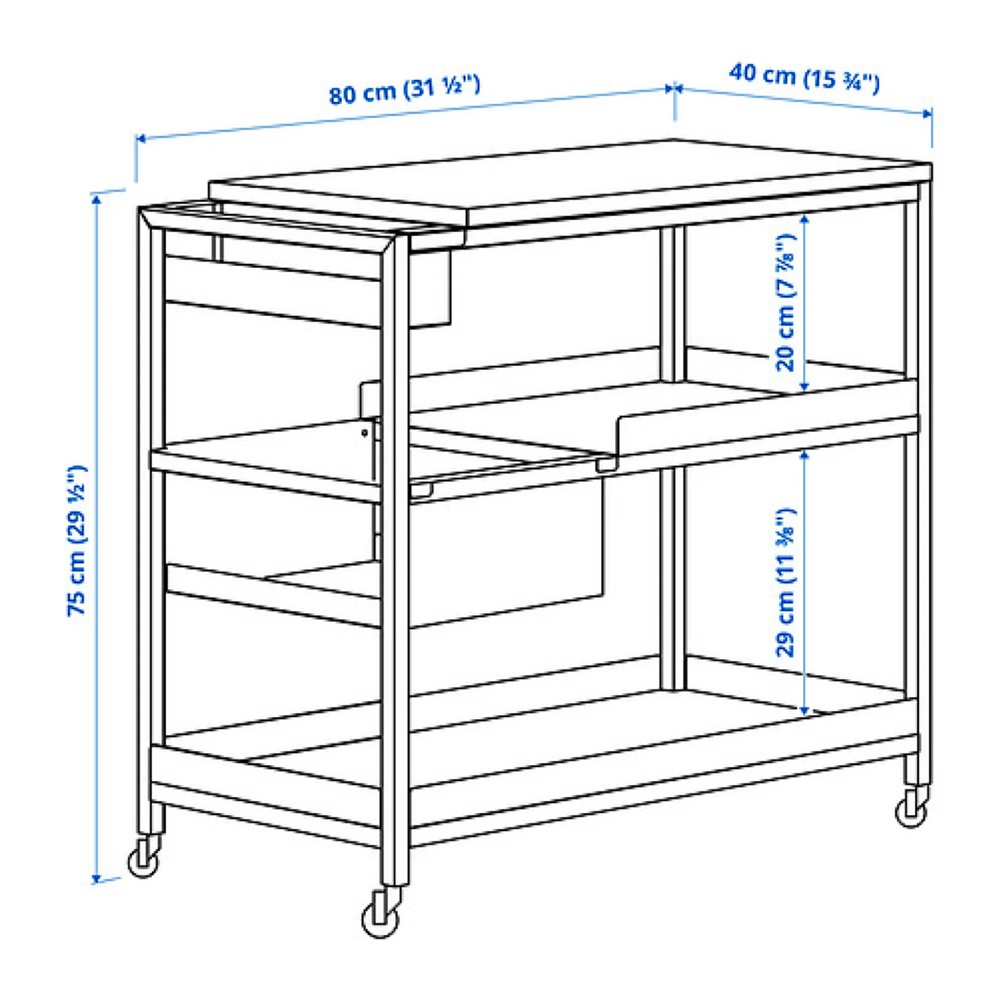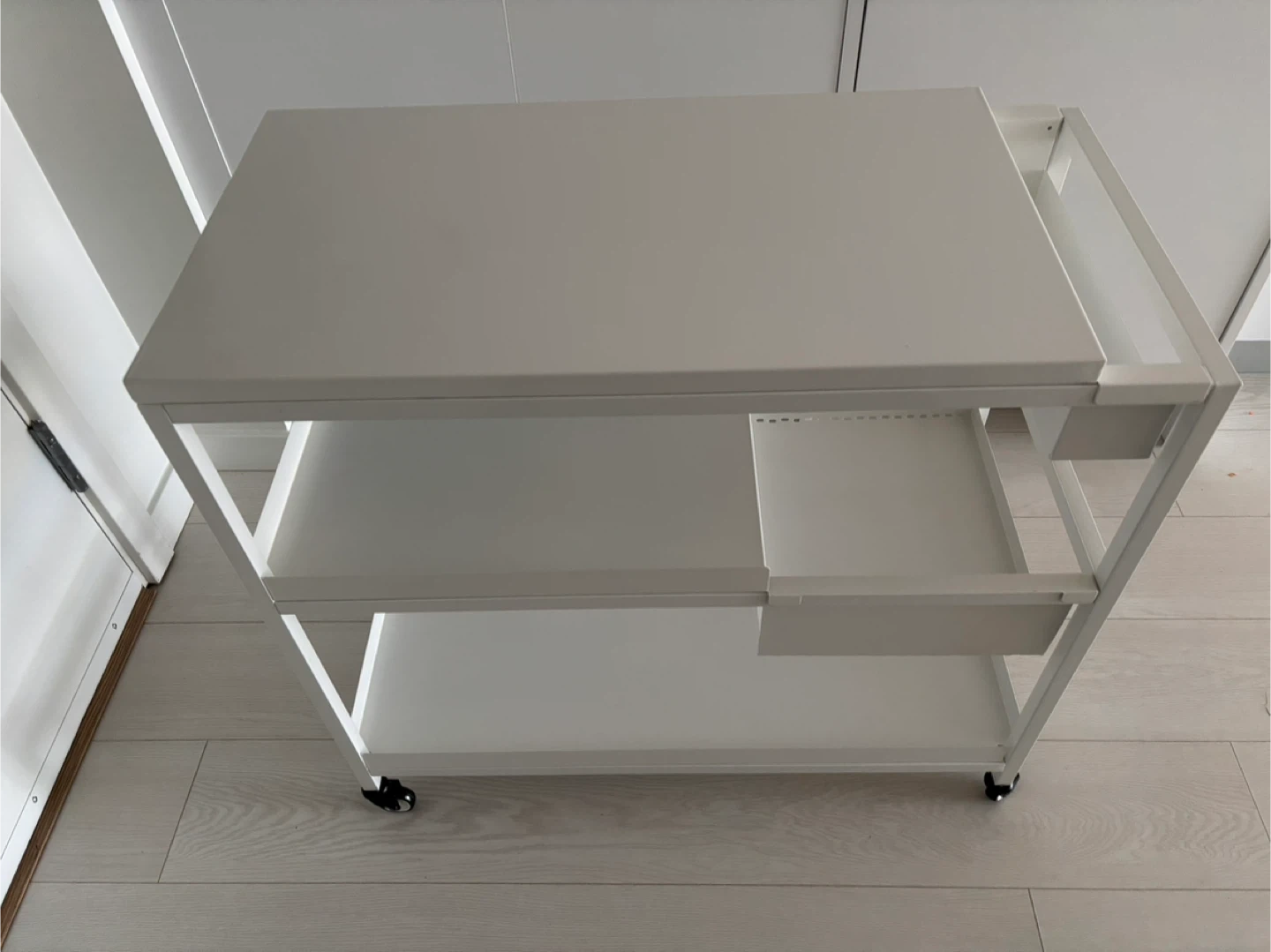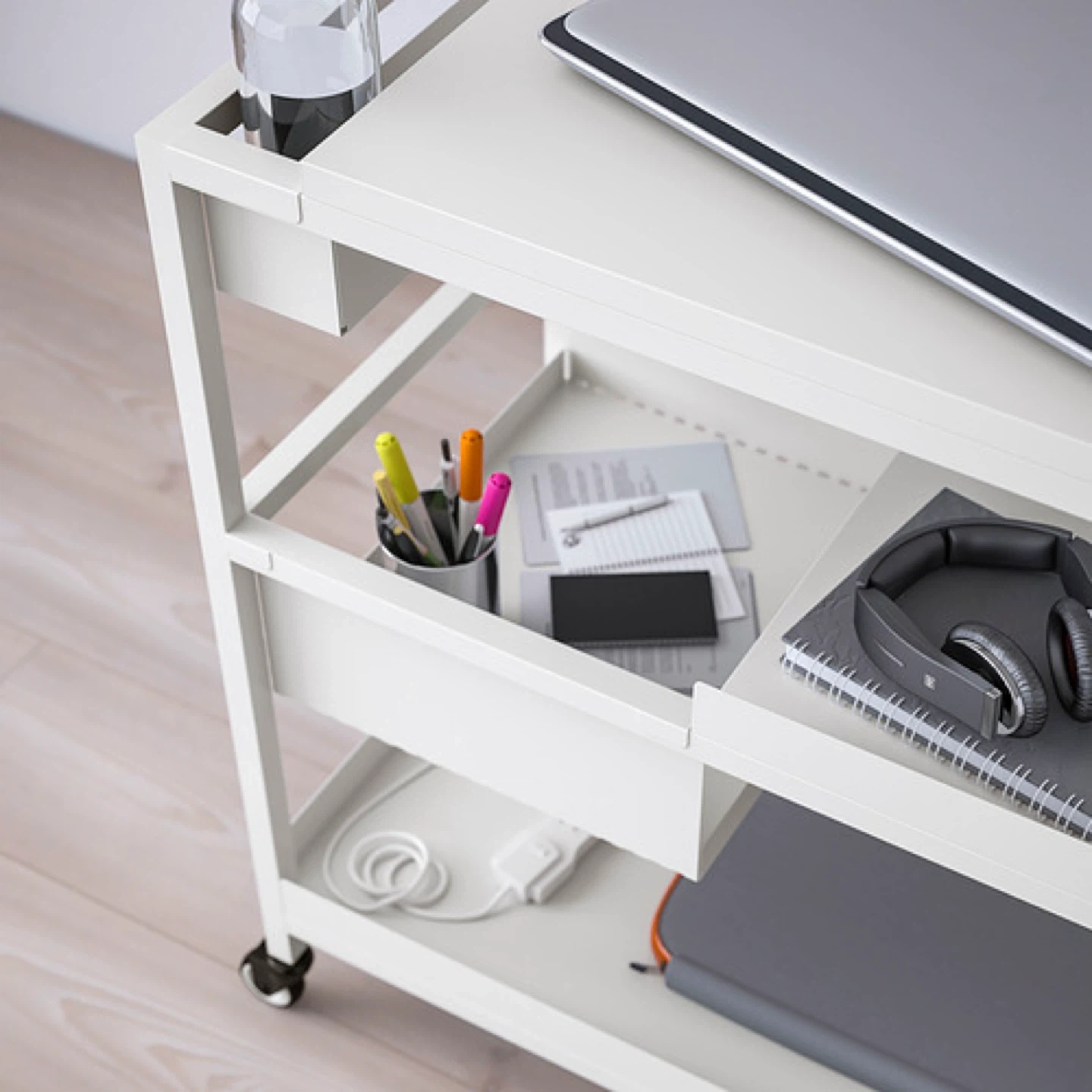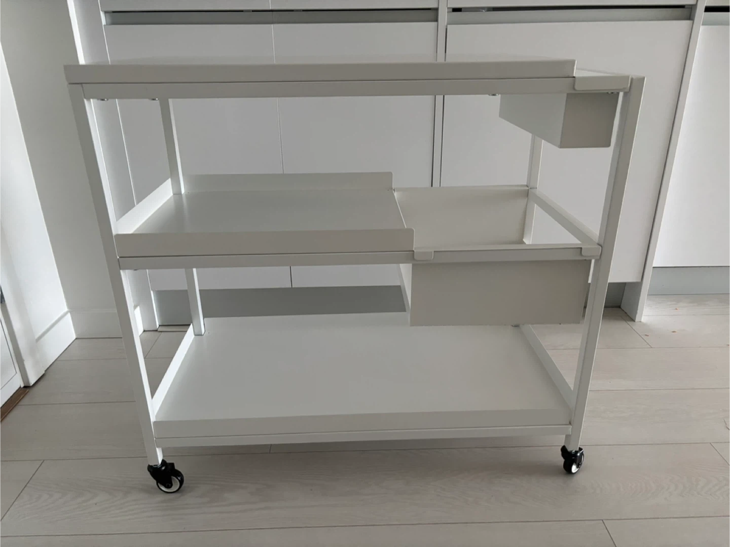 TROTTEN utility cart 80x40 white TROTTEN trolley has compartments in generous sizes with plenty of room for your things. Place the trolley near your desk to enjoy more workspace or have practical storage close at hand. The trolley has the same dimensions as the desktop of TROTTEN desk. Take the trolley with you to the workshop or meeting room, filled with glasses, water, coffee mugs and other things that you need for a successful meeting. A practical handle, robust construction and four castors make it easy for you to pull the trolley and use it wherever you like. Some compartments are removable. Perfect to use as extra storage on the desk or in the workshop space.