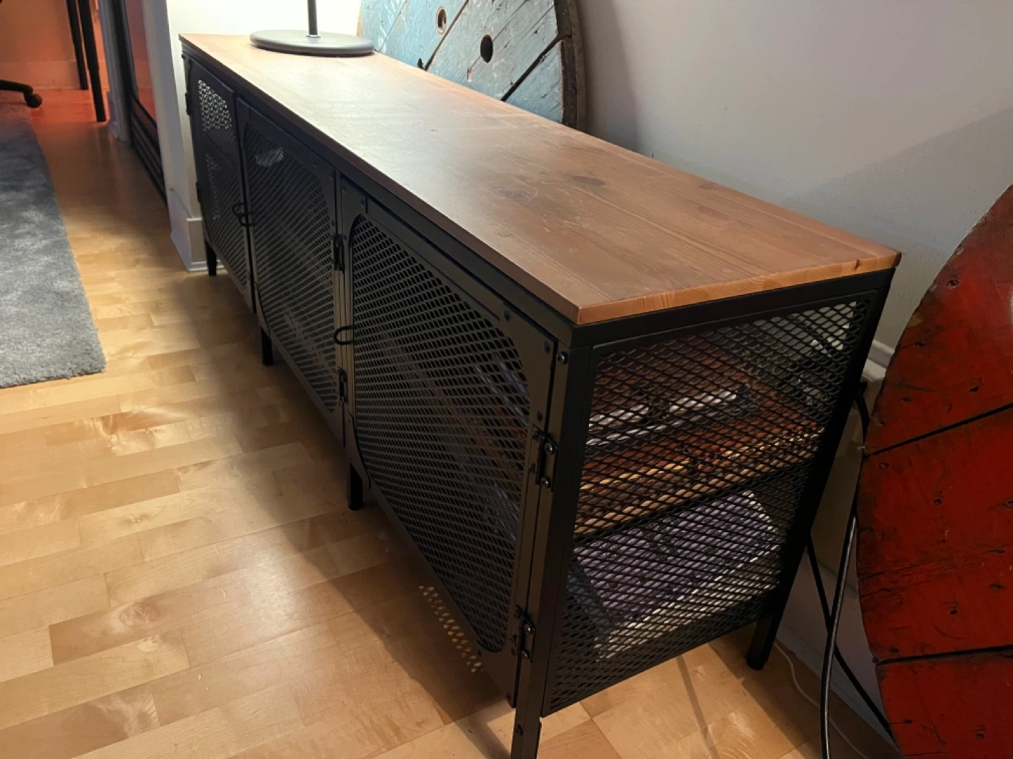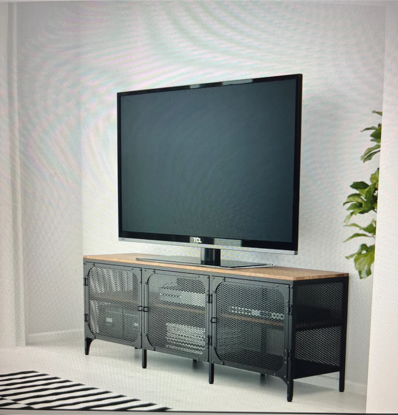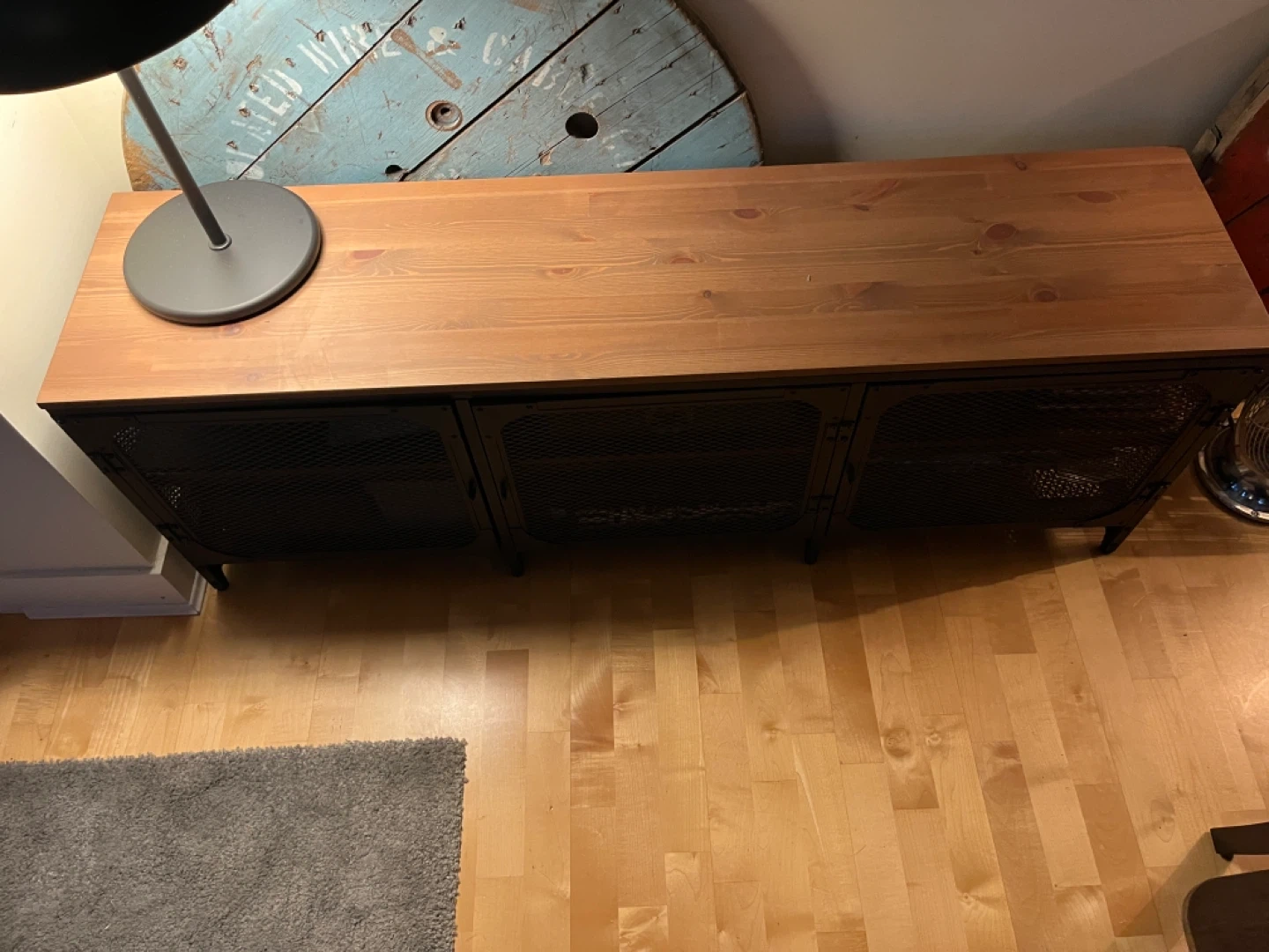 Selling an IKEA TV stand with a black metal frame and wooden top. It measures approximately 59 inches (150 cm) in length, 21 1/4 inches (54 cm) in height, and 14 1/8 inches (36 cm) in depth. Great for adding a modern touch to your living room! Like new. Already assembled.