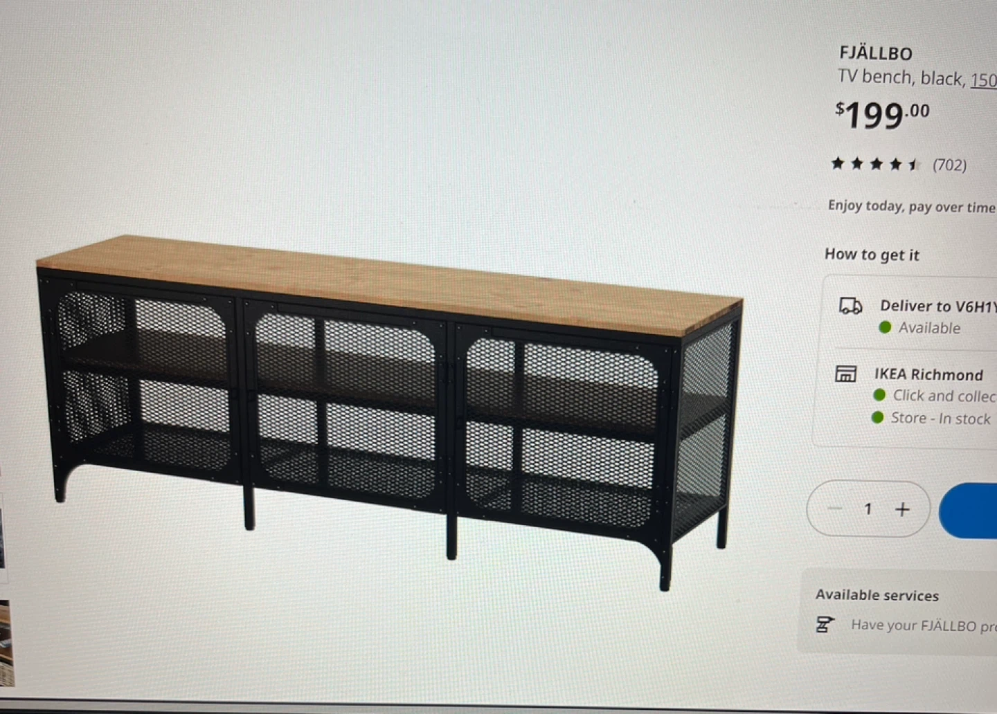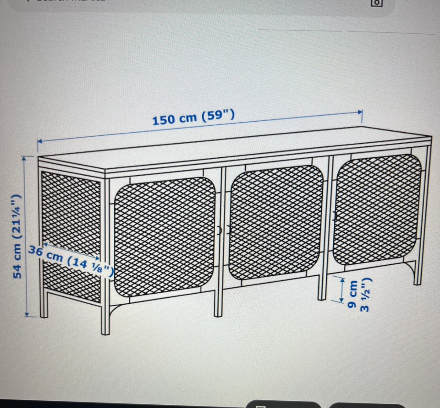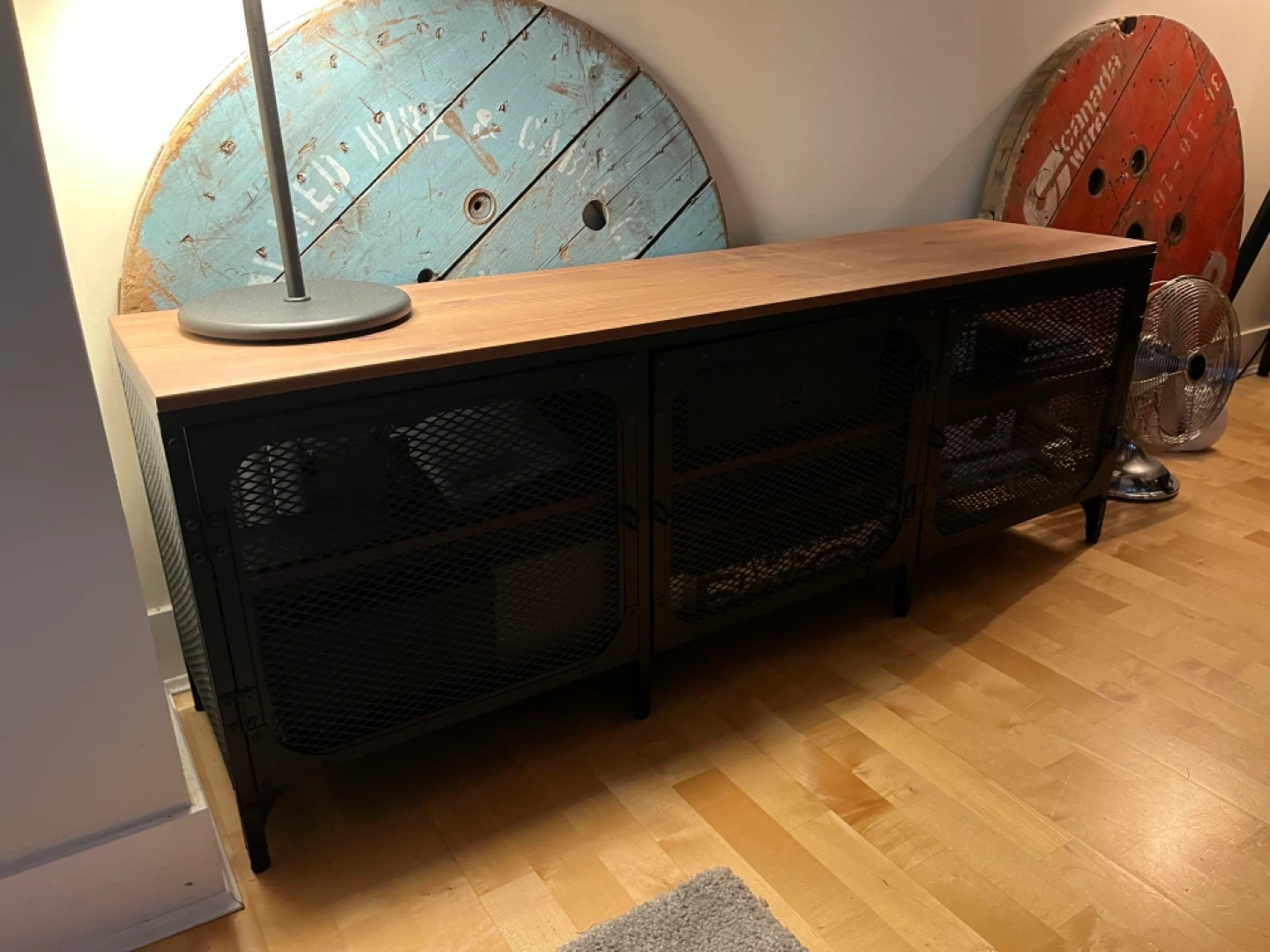 Selling an IKEA TV stand with a black metal frame and wooden top. It measures approximately 59 inches (150 cm) in length, 21 1/4 inches (54 cm) in height, and 14 1/8 inches (36 cm) in depth. Great for adding a modern touch to your living room! Like new. Already assembled.