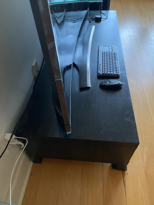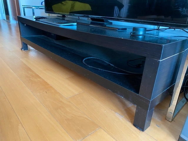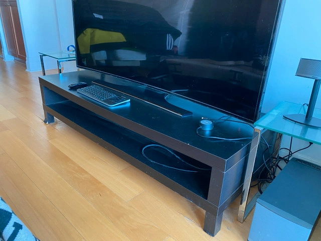 A black IKEA TV table is perfect for a 65” TV in your living room setup, offering a sleek and simple design to complement any decor. It's in good, used condition, with some minor wear and tear. * Spacious top surface for large TVs * Open shelving for media devices and storage * Easy to assemble and clean * Dimensions: 150cm long X 55 cm wide X 35cm high. Perfect for a 65” TV or smaller one. I'm asking $30 because it is better quality. If the ad is up, it's still available. Happy viewing!