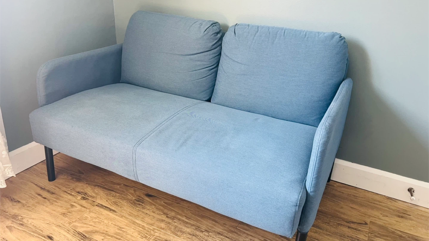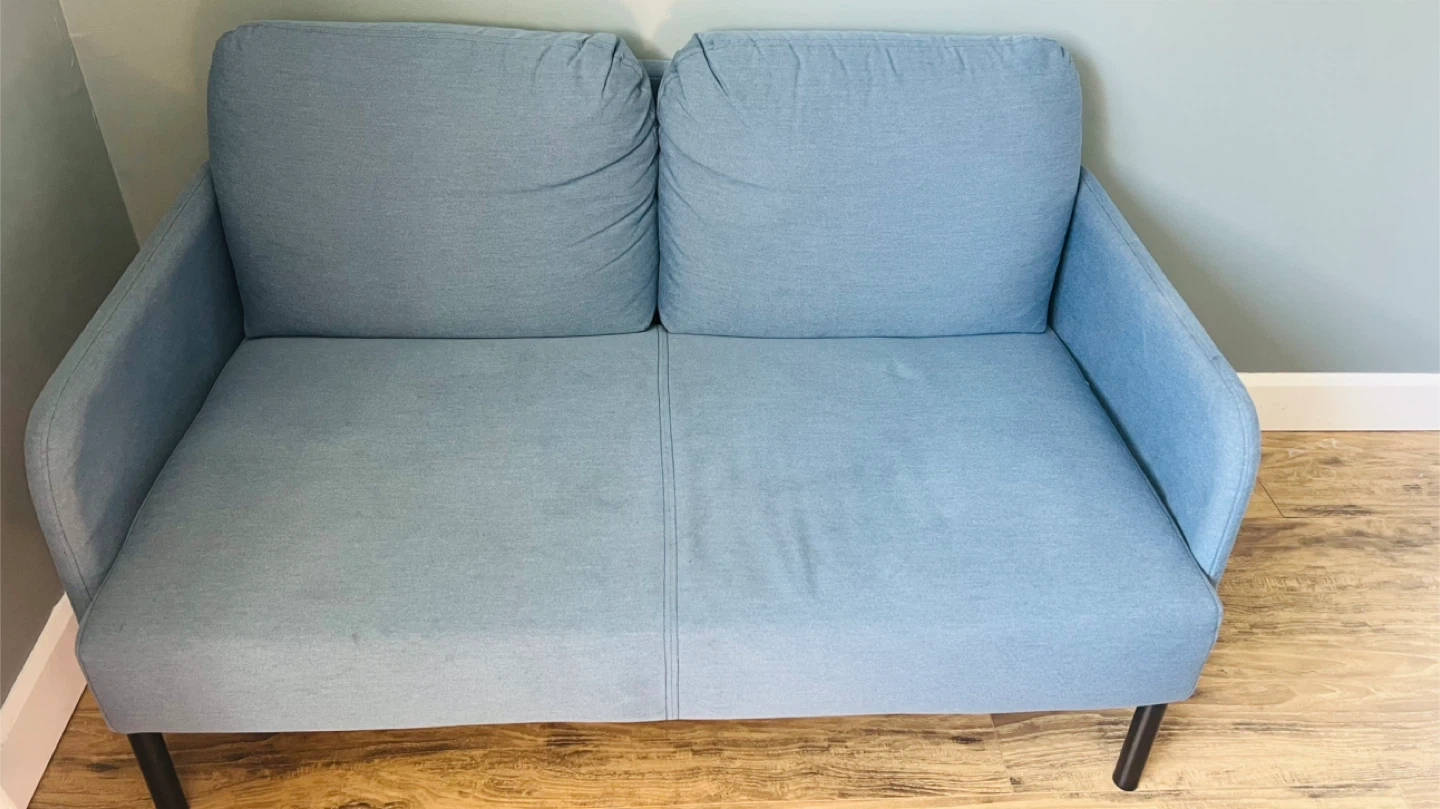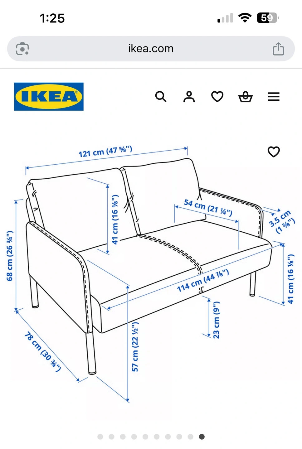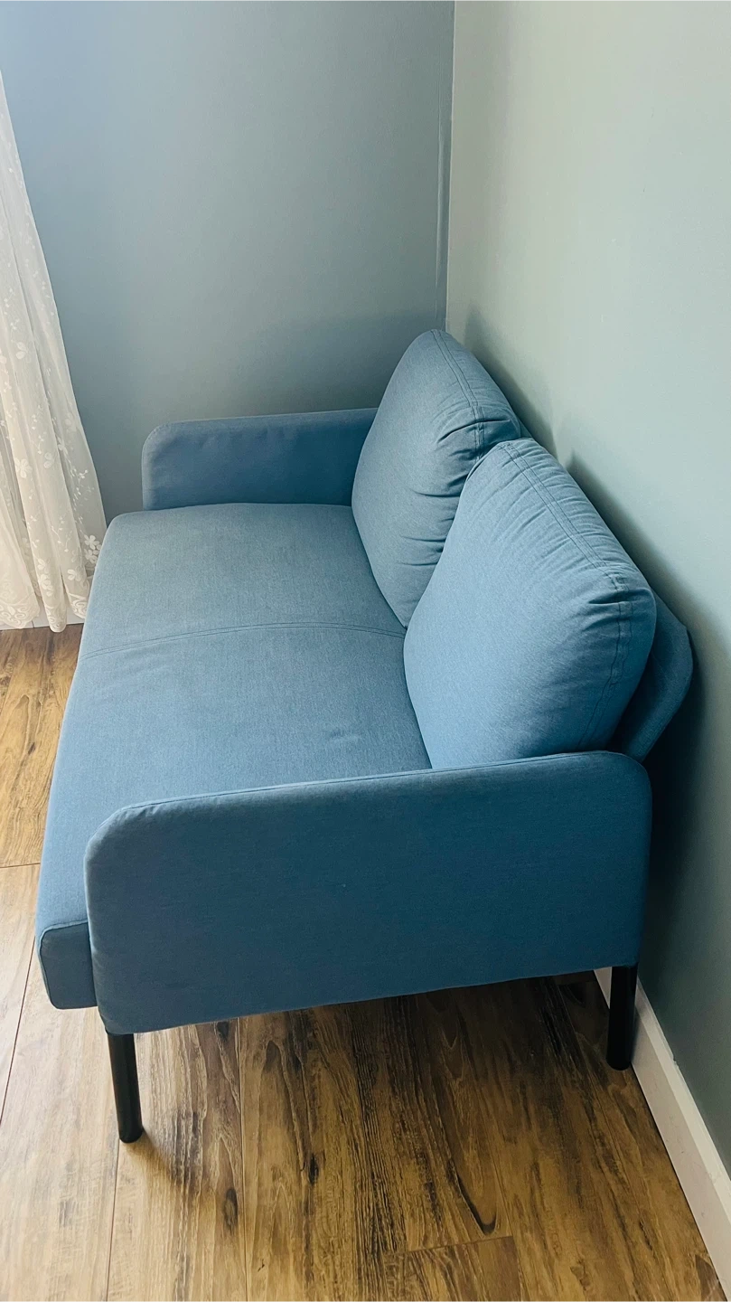 Selling a comfy two-seat sofa from IKEA! It's in great condition and features a lovely light blue colour. Perfect for a small space or apartment. Dimensions are approximately 121cm (47 5/8") wide and 68cm (26 3/4") high.