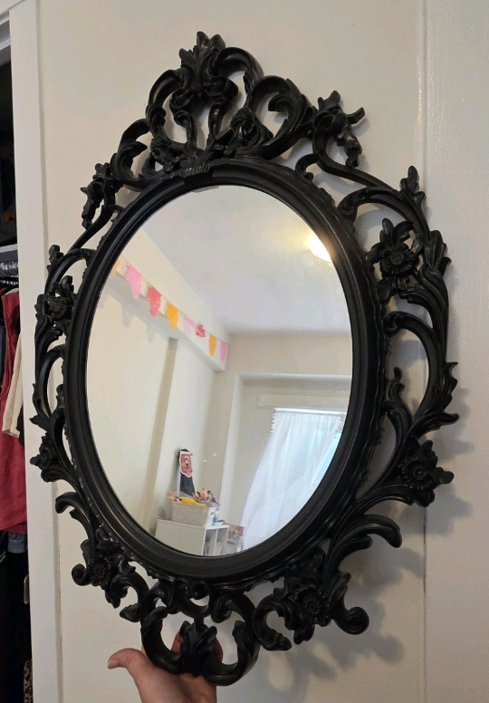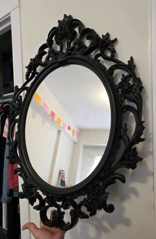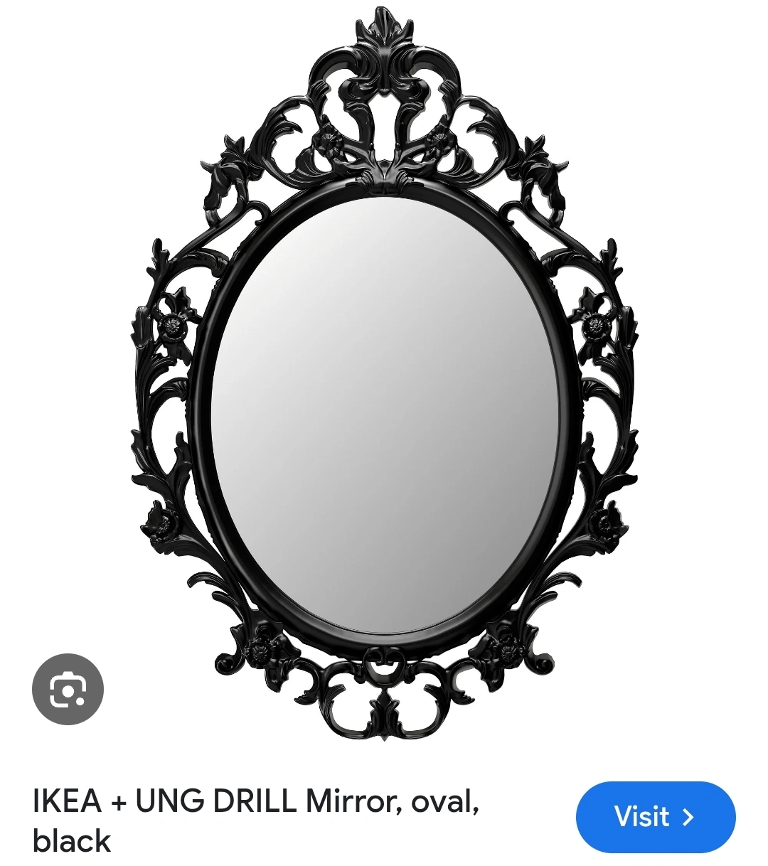 Selling a lovely black oval mirror from IKEA. It's in great shape and it's super light Ung Drill Mirror, Oval, Black Product size Width: 59 cm Height: 85 cm Materiall: Polystyrene plastic