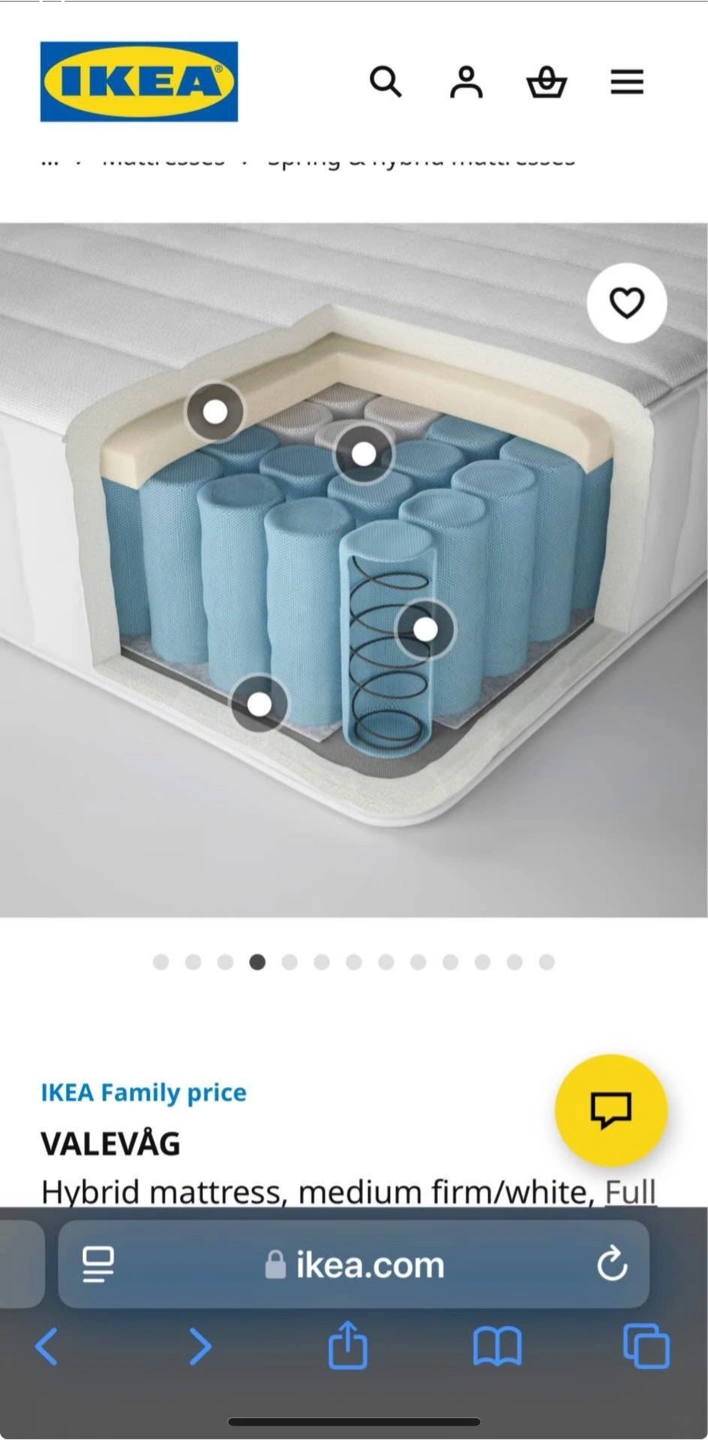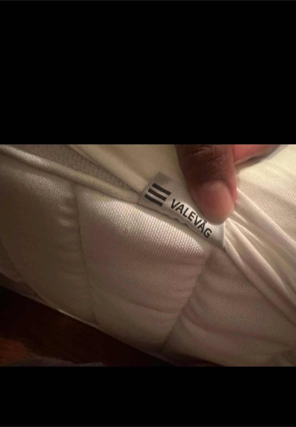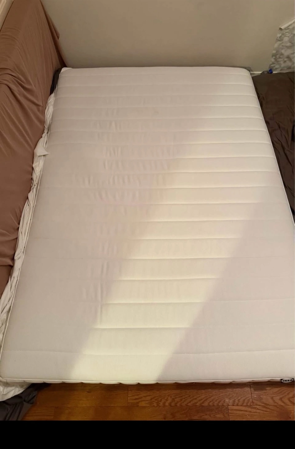 Selling an IKEA VALEVÅG hybrid mattress in full size. It's a medium-firm mattress. Dimensions are 135 cm x 189 cm. Also included is a GRUSNARV waterproof mattress protector for full/double size and a NATTJASMIN fitted sheet in dark gray, also for full/double. Originally, the mattress was $429 and the protector was $32.99