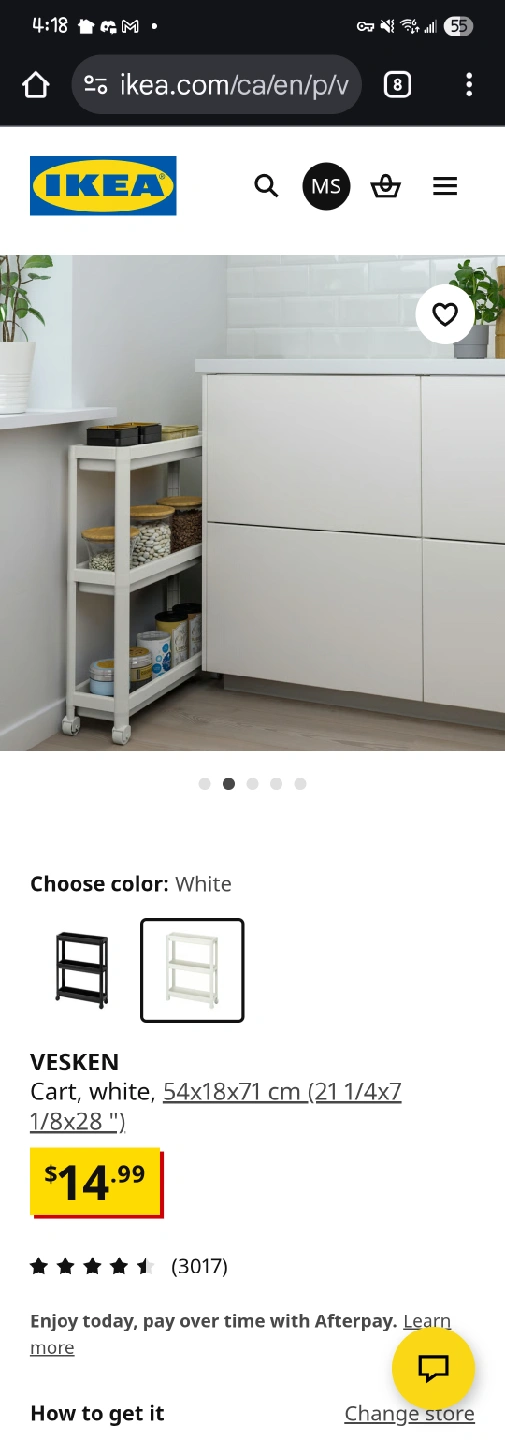 Selling a like-new IKEA VESKEN cart in white! relatively new, maybe 4 months in use, but im rearranging space and no longer need it! This cart is perfect for adding extra storage to your bathroom, kitchen, or any small space. It's lightweight and easy to move around, with dimensions of 54x18x71 cm (21 1/4x7 1/8x28 "). A great way to keep your bottles, soaps, and small items organized
