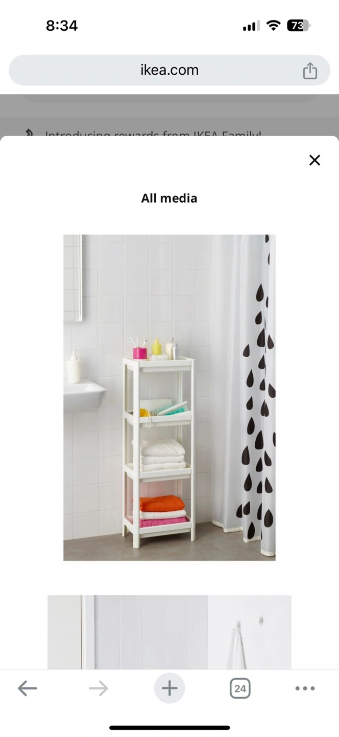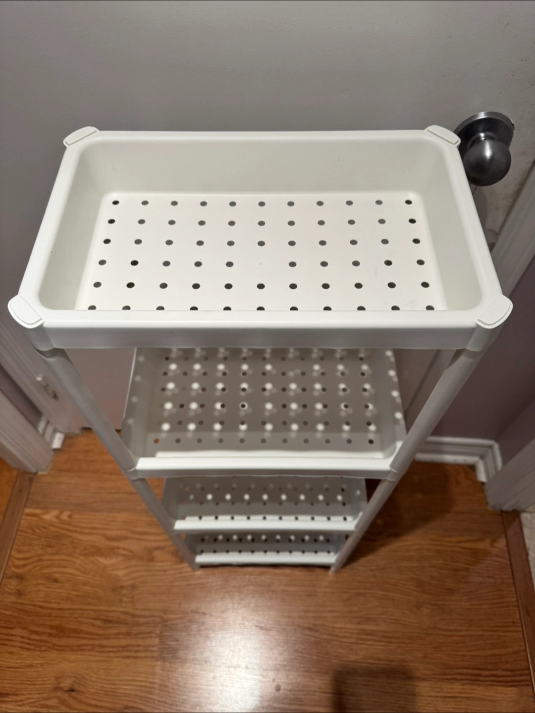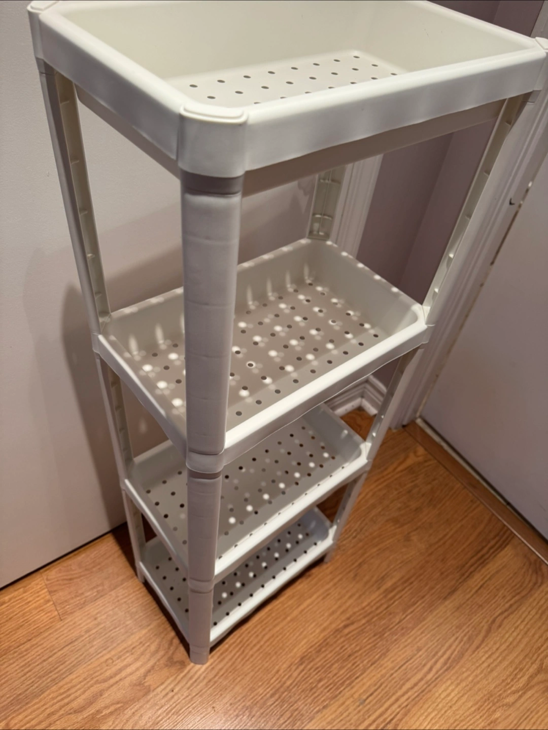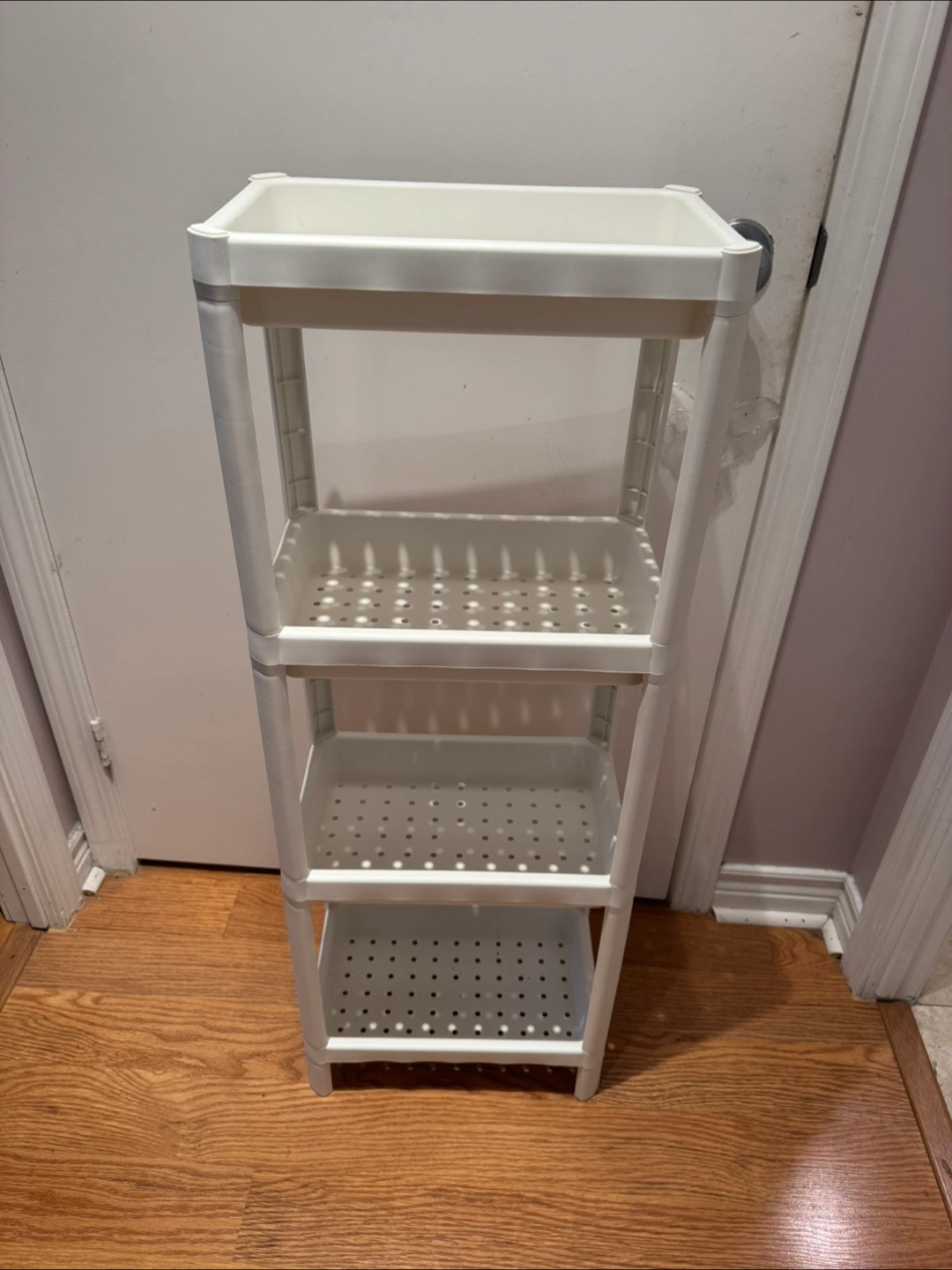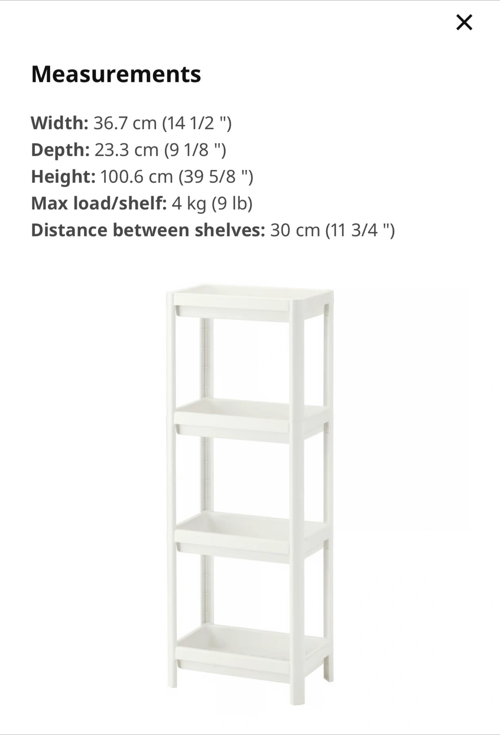 5This IKEA Vesken shelving unit is perfect for adding some extra storage to any room! It's in great condition and ready for a new home. Here are the measurements: - Width: 36.7 cm (14 1/2 ") - Depth: 23.3 cm (9 1/8 ") - Height: 100.6 cm (39 5/8 ") - Max load/shelf: 4 kg (9 lb) - Distance between shelves: 30 cm (11 3/4 ")