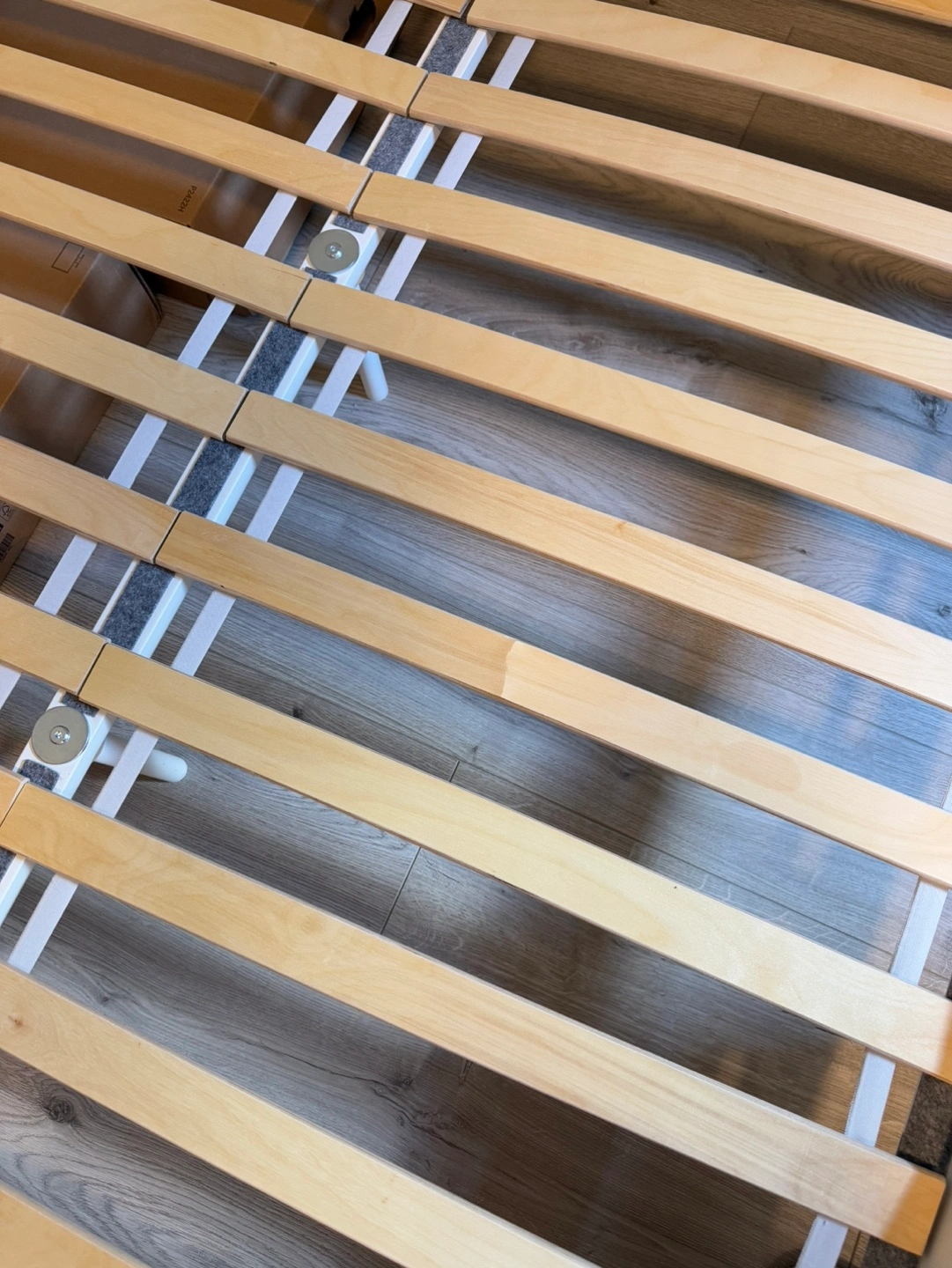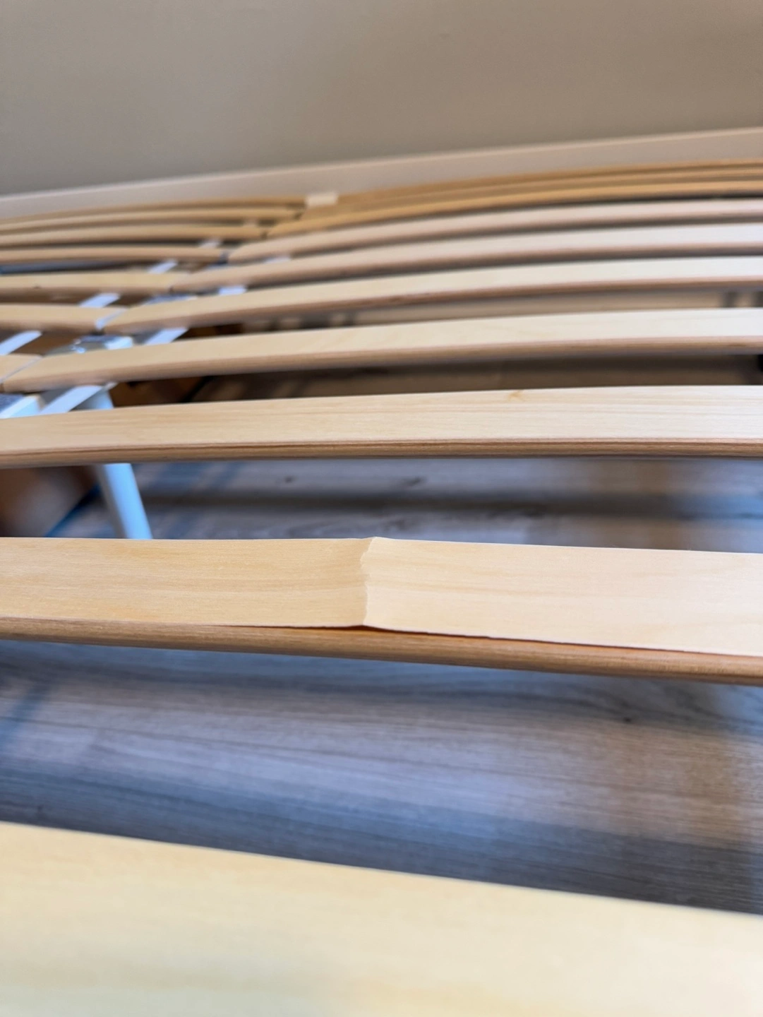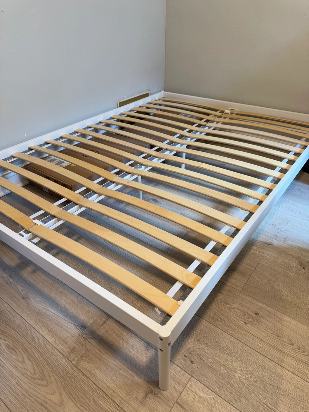 10IKEA VEVELSTAD White Bed Frame Double size. Simple design, good condition. Dimensions: 135*191 cm; 53’’1/8 * 75’’1/4 Used only 1 year, selling because moving. Slight wear on 1 panel top layer coating but the panel itself is solid. Pick up Feb 28th