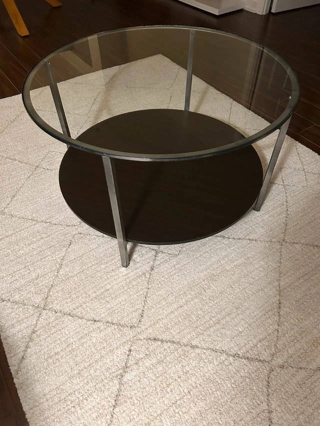 12The VITTSJÖ coffee table is made of durable, high-quality materials that are easy to maintain. It also offers extra storage space on the lower shelf. Note: This particular table has been sprayed with metallic aluminum paint, which explains the reduced price, as it is no longer fully black, but rather metallic aluminum and black. Measurements: Height: 45 cm (17 3/4") Diameter: 75 cm (29 1/2") Price (New): $69.99 Price (Used): $20 More details can be found here: https://www.ikea.com/ca/en/p/vittsjoe-coffee-table-black-brown-glass-80213309