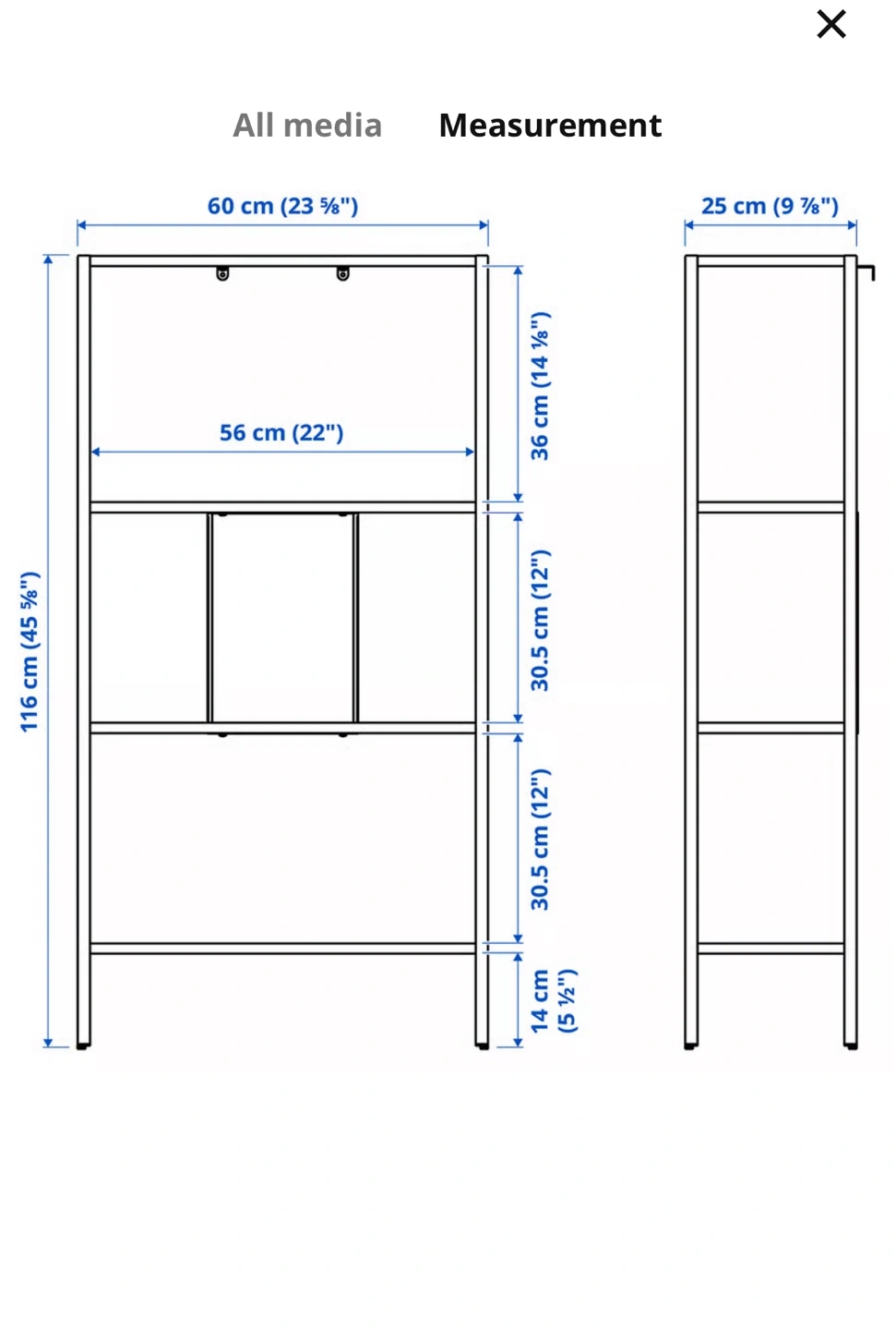 I'm selling an IKEA Vittsjö shelf unit in white! It's in great shape and ready to hold your books, plants, or anything else you'd like to display. The dimensions are: - Width: 60 cm (23 ¼") - Depth: 25 cm (9 ⅞") - Height: 116 cm (45 ⅝")