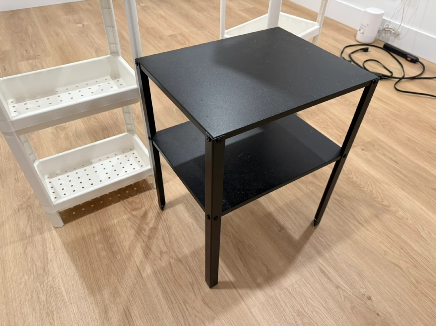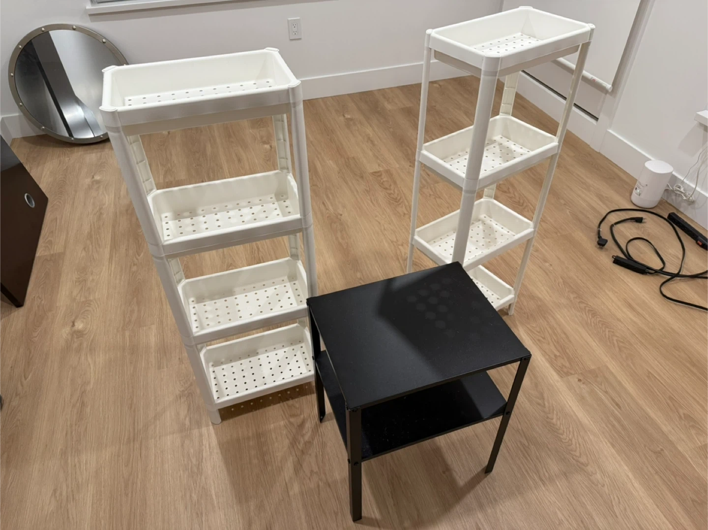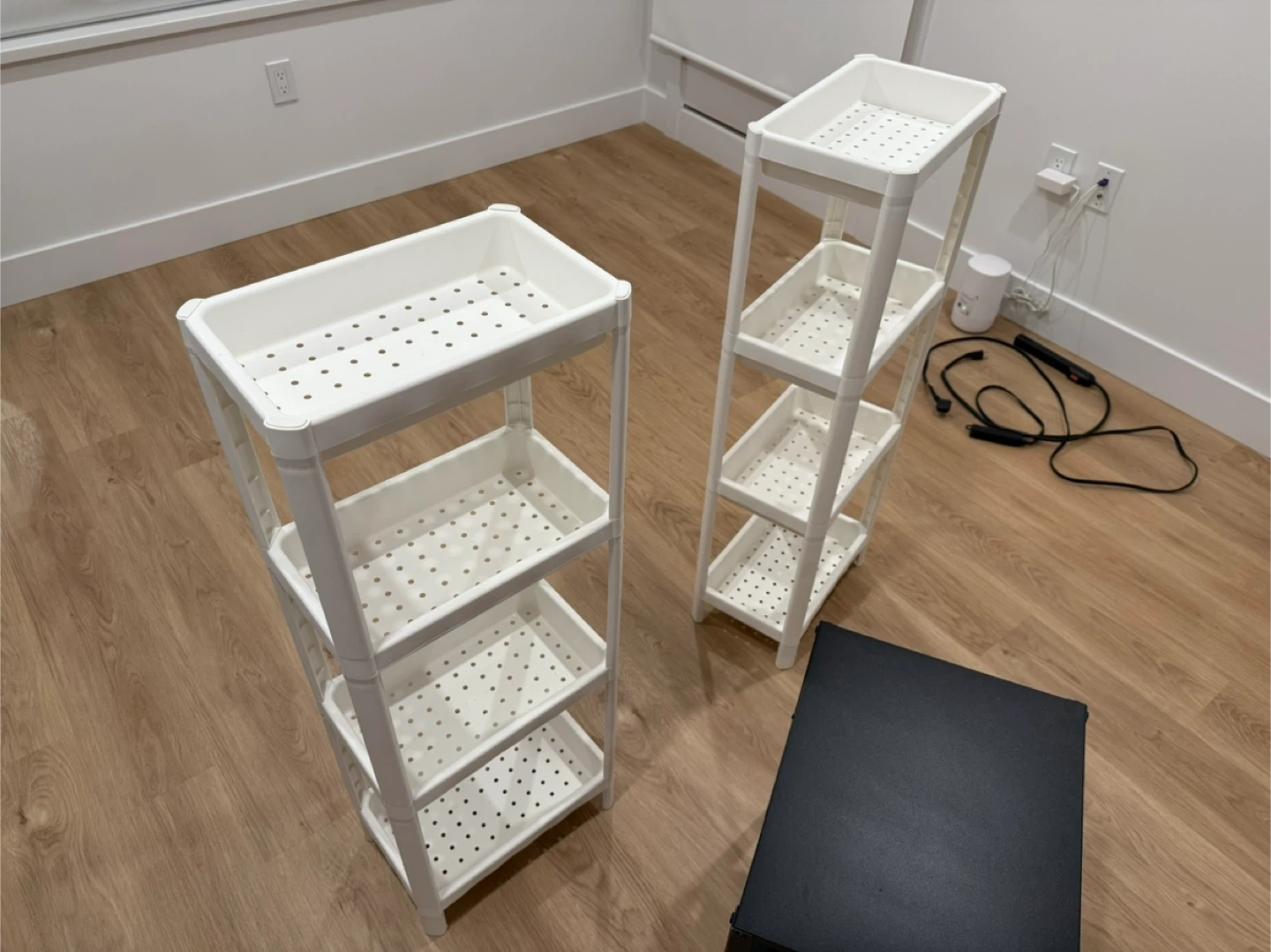 20Selling two IKEA shelving units. One is white and taller with four shelves, and the other is black and shorter with two shelves. Both are in great condition and perfect for organizing your space!
