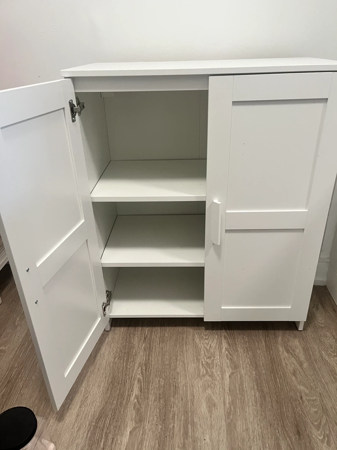 I'm selling a white cabinet with doors. It has a clean and simple design, perfect for extra storage in any room of your home. It features multiple shelves for organization. It's in great condition and ready for a new home