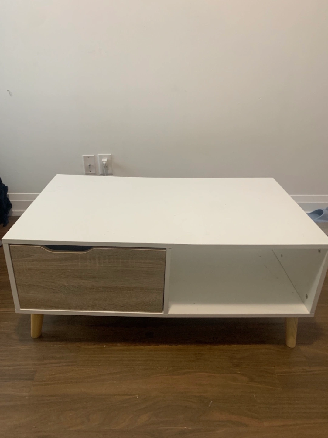 43Must pick up before Saturday IKEA White coffee table with a drawer and shelf, wooden legs.