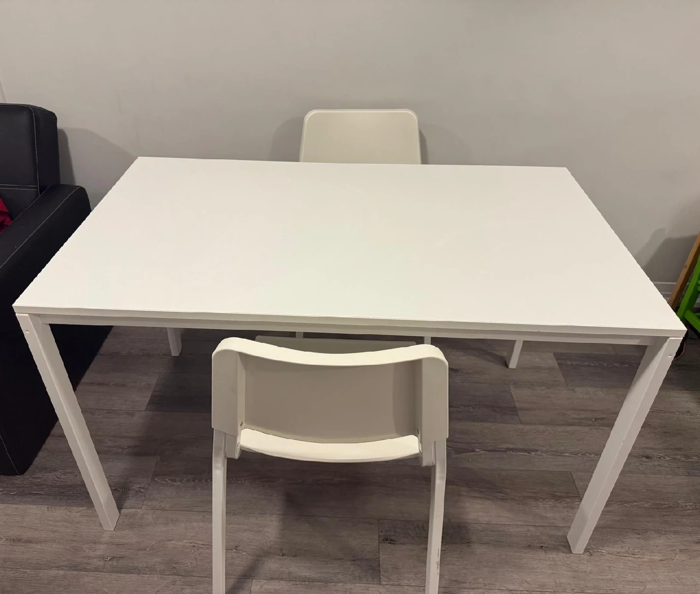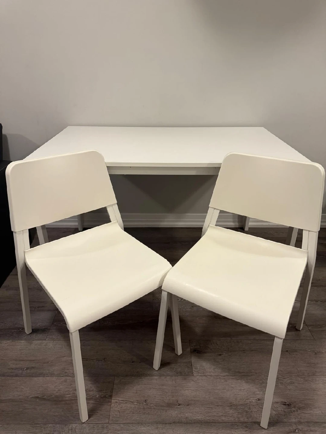 10Selling a simple and clean white dining table from IKEA, along with two matching chairs! It's perfect for a small space or starter set. The set is in great condition and ready for a new home. If you're interested, send me a message!