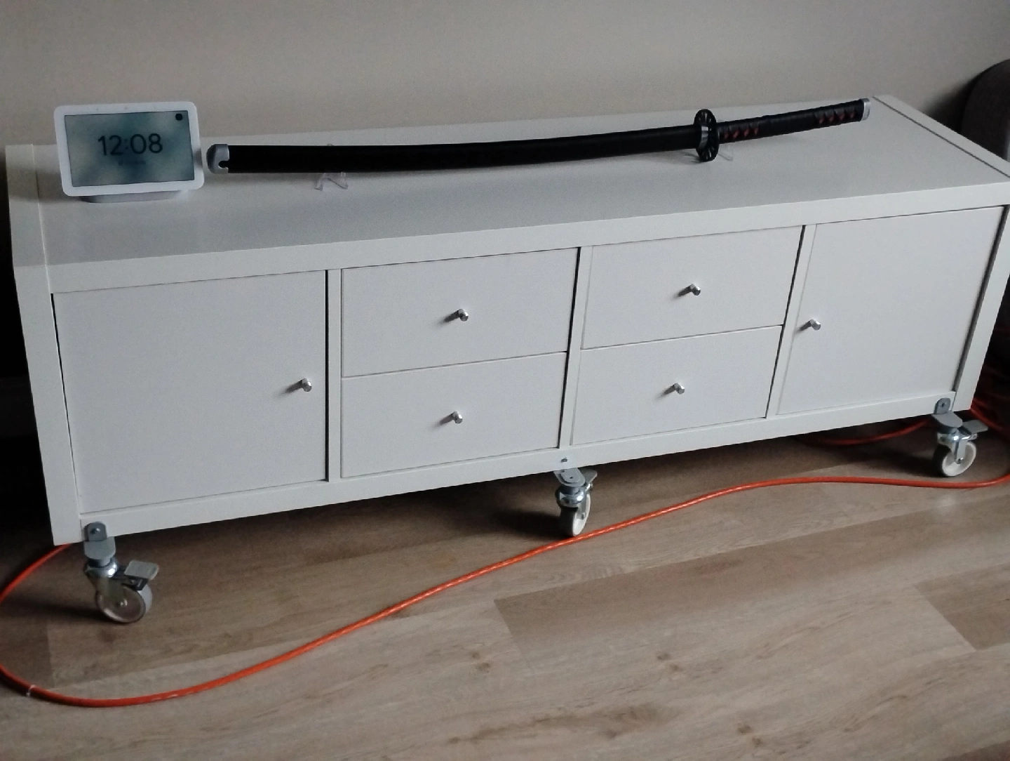 58Selling an IKEA media unit in white. It has drawers and doors for storage, and it's on wheels, making it easy to move around. Perfect for your living room or entertainment area! a couple small scuffs on the top barely noticeable