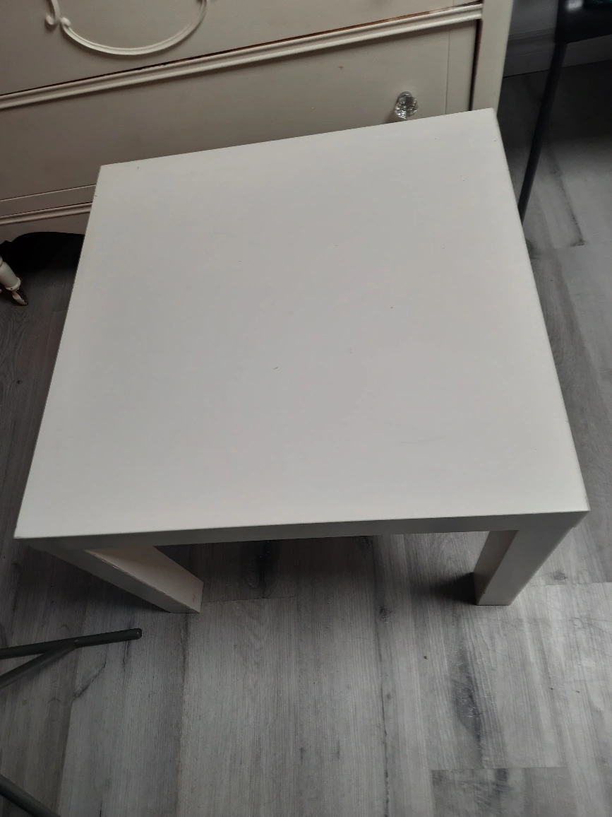246Offering a small square table. Has white painted legs. Features a particle board top. Perfect for holding a cup of tea while you unwind.
