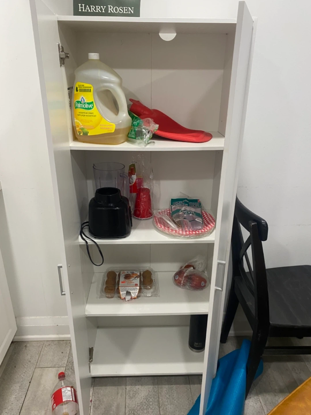Selling a white wardrobe closet. It has two doors and silver handles. Shelves inside. Perfect for adding extra storage space!