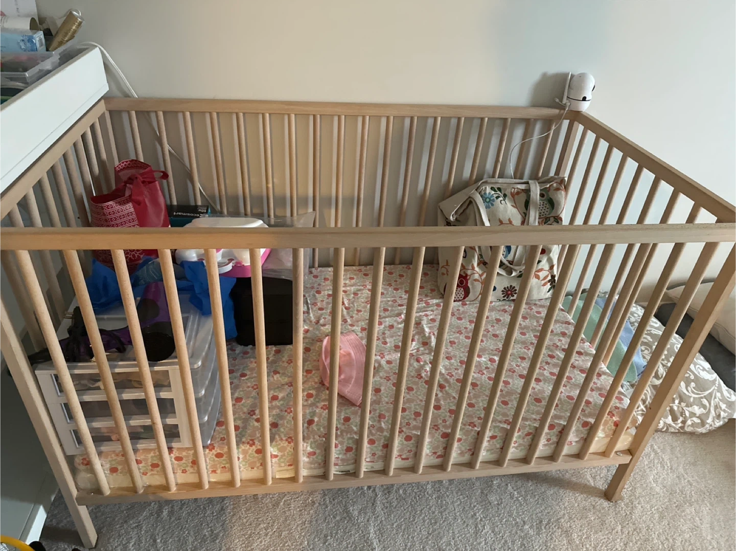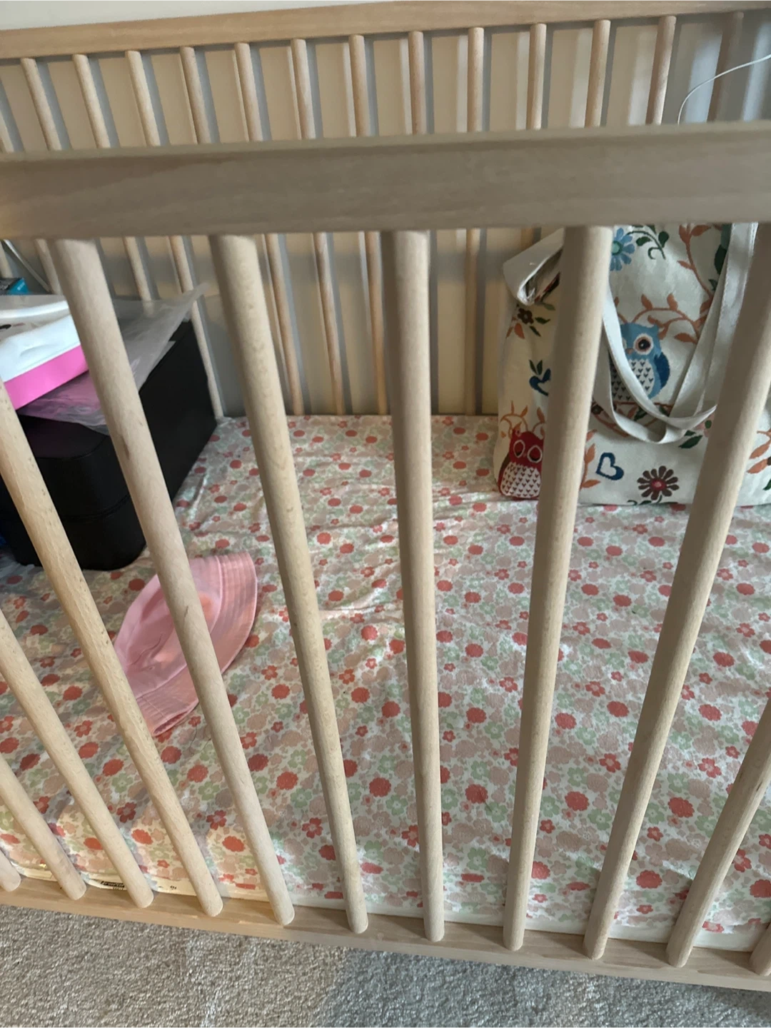 Selling a gently used wooden baby crib. It's in great condition and ready for a new little one! The crib has a natural wood finish, blending seamlessly with any nursery decor Includes baby mattress.