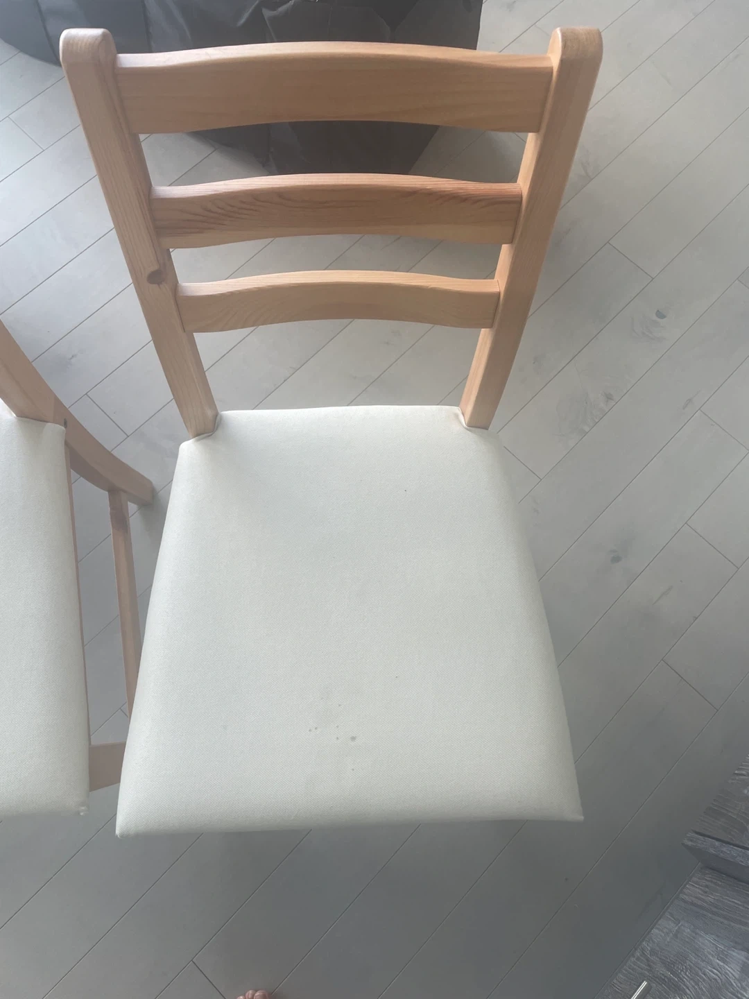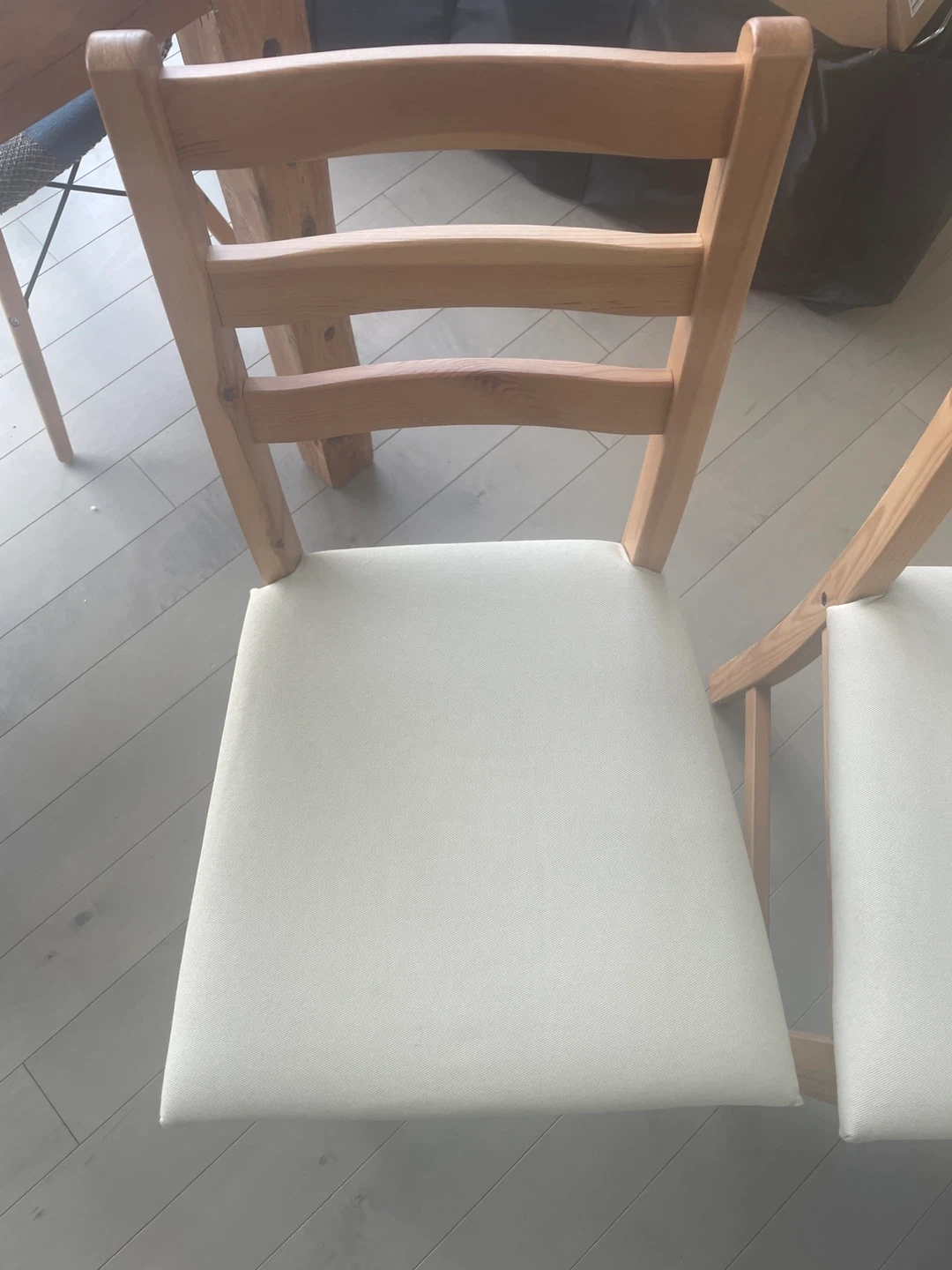 Selling a set of wooden dining chairs featuring comfy white cushions! These chairs are perfect for adding a touch of simple elegance to your dining area. They're sturdy and in good condition, ready to be a part of your home.