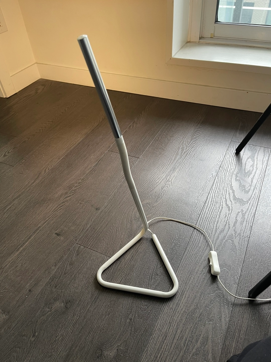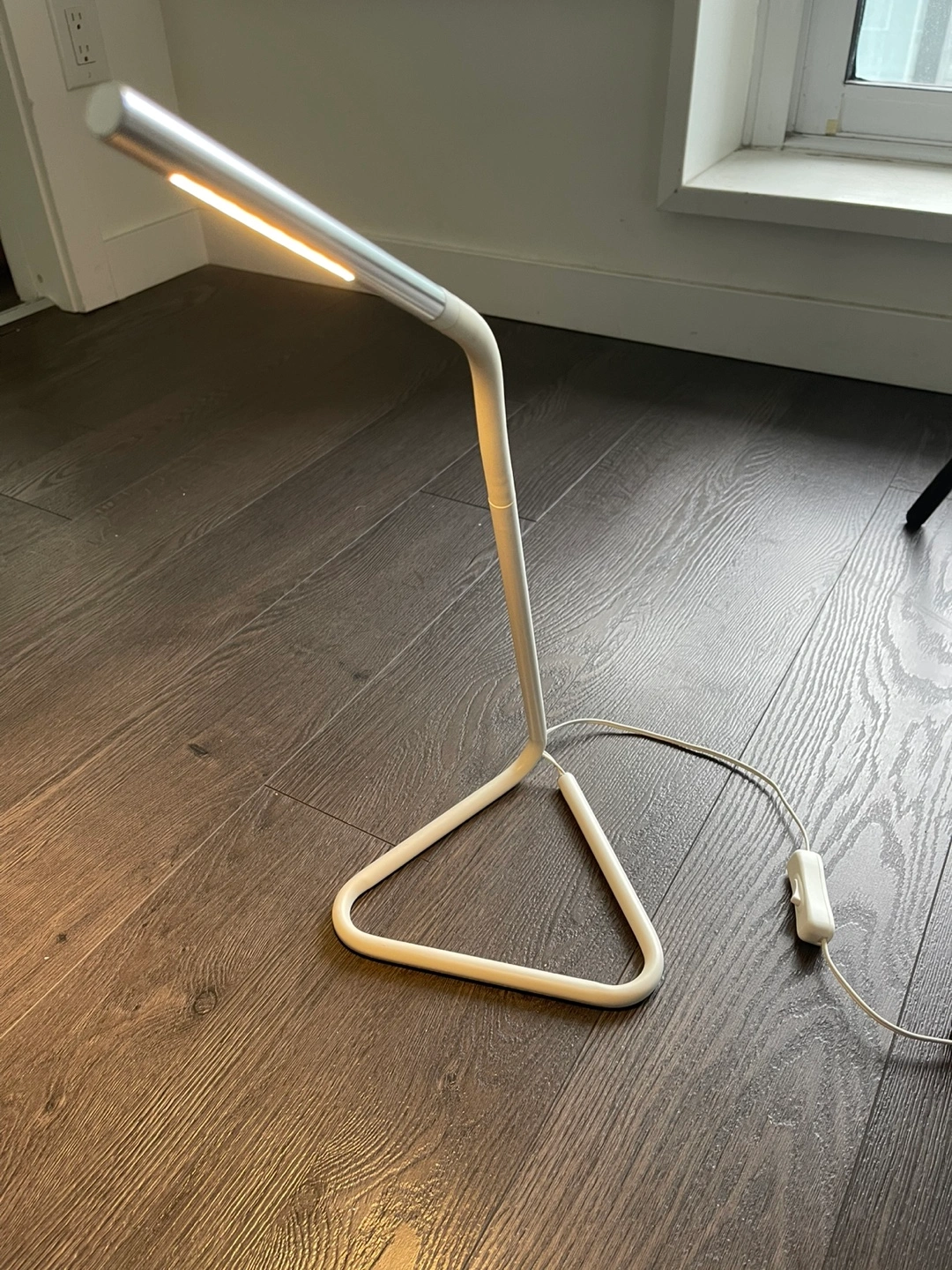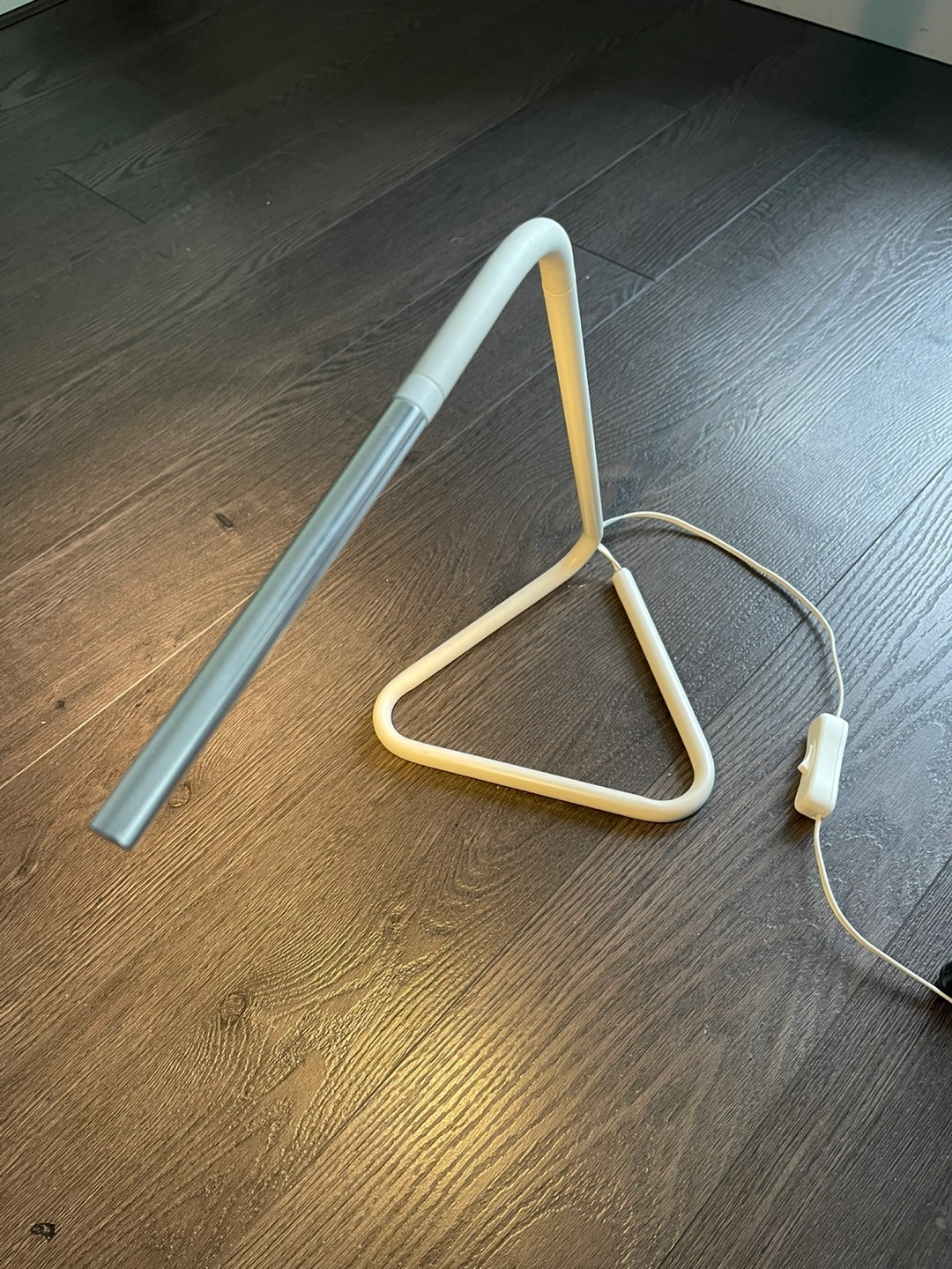 139White and silver desk lamp with a triangular base. The lamp has a flexible arm and a built-in LED light.