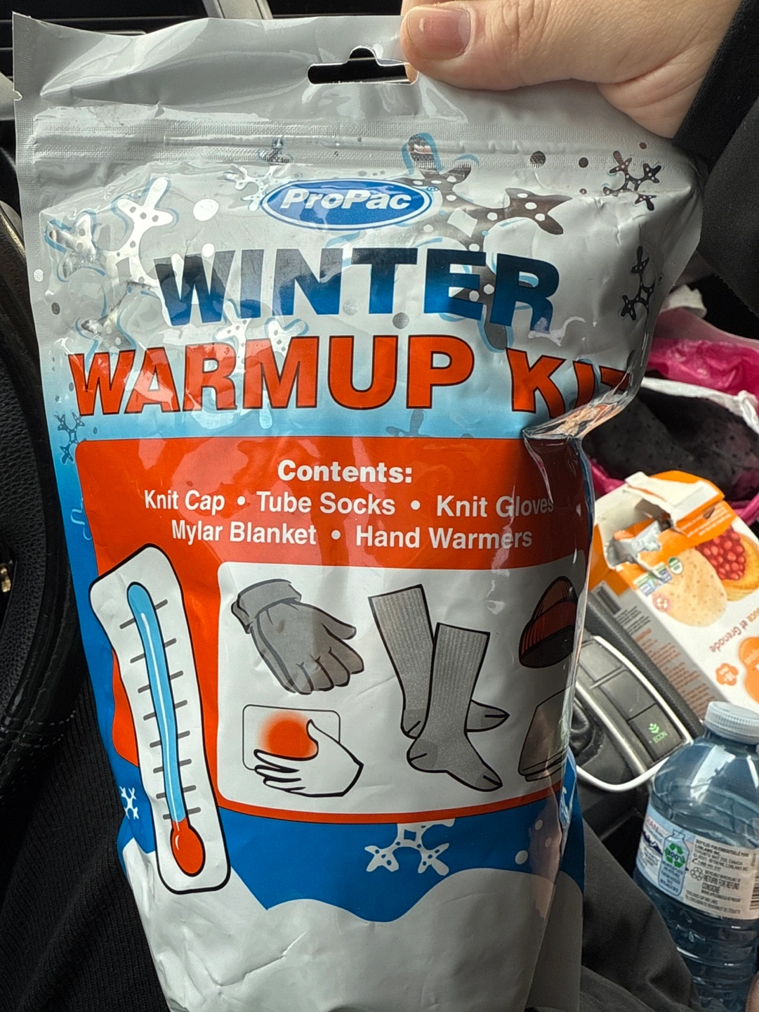 New winter survival kit. Includes knit cap, tube socks, knit gloves, mylar blanket, and hand warmers. Perfect for cold weather emergencies.