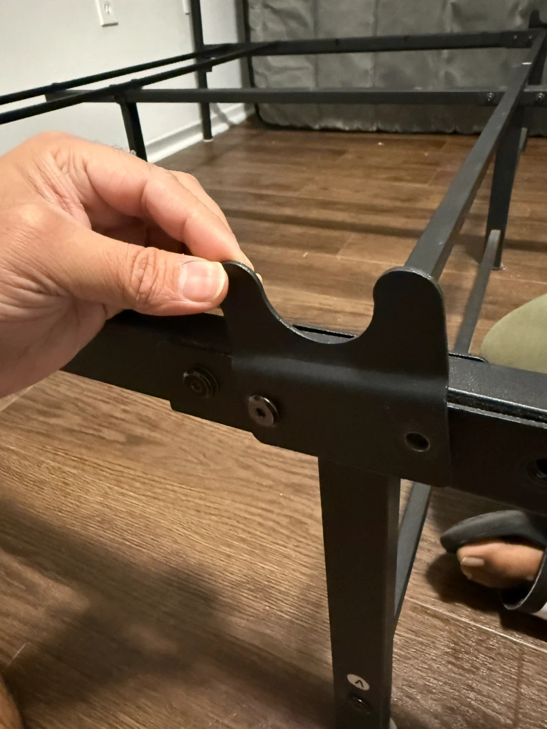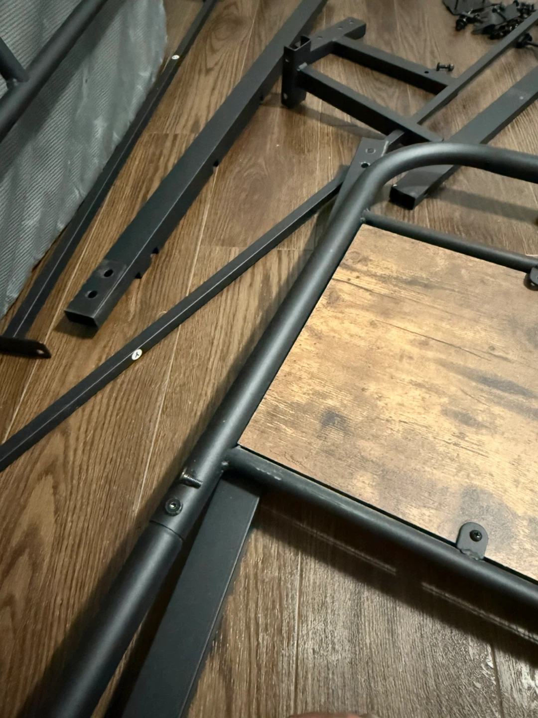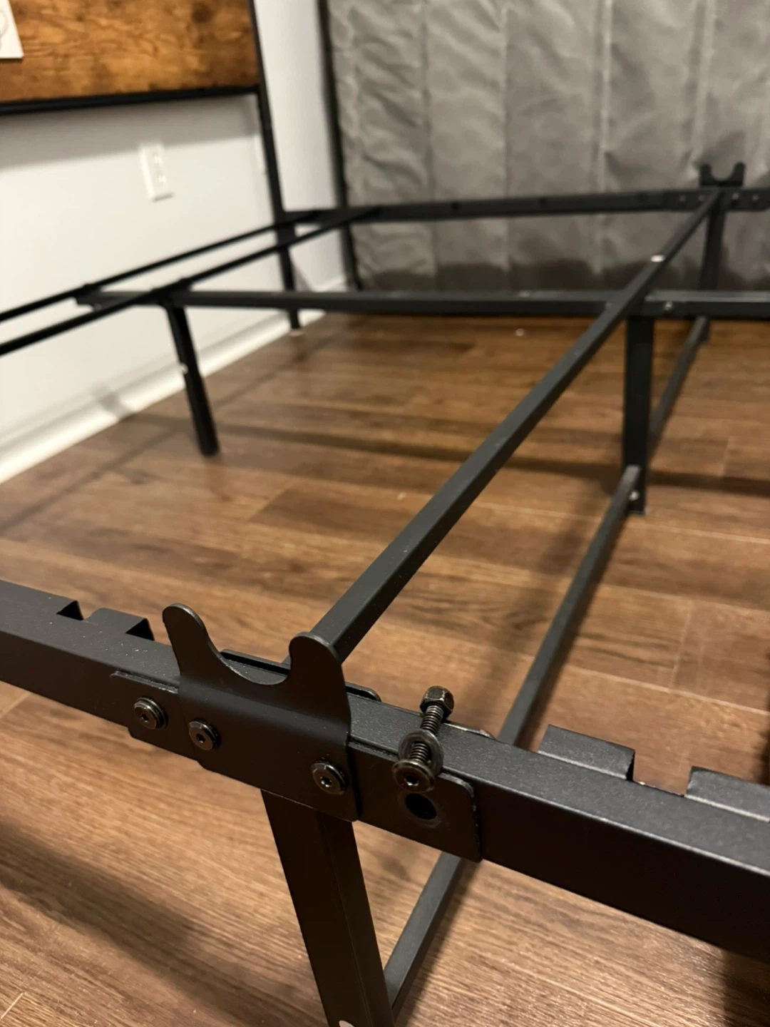 Queen-size metal bed frame with a modern industrial design. Strong steel slat base provides excellent support — no box. Headboard features a wood-finish accent that looks great in any bedroom.