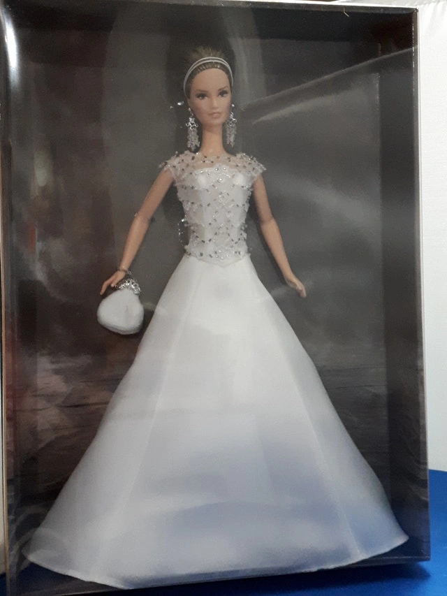Brand new in shipper, this Gold Label Collector Doll features the Badgley Mischka Bride Barbie B8946. This chic modern bride is contemporary yet wonderfully romantic. The bodice has opulent iridescent beading, rhinestones, and embroidery, leading to a full skirt of satin-faced silk organza over a taffeta underskirt. She comes with crystal chandelier earrings, a solitaire rhinestone ring, a white headband, a white velvet evening bag, and pearl-white high-heel shoes. Collection: Designer Brides™ Barbie® Dolls. Label: Gold Label®. Release Date: 5/1/2003. SKU #: B8946. Other Barbies also available. Smoke-free home. Public pick up in the Walkers and Upper Middle area of Burlington. Prices are firm. Check out my other posts.