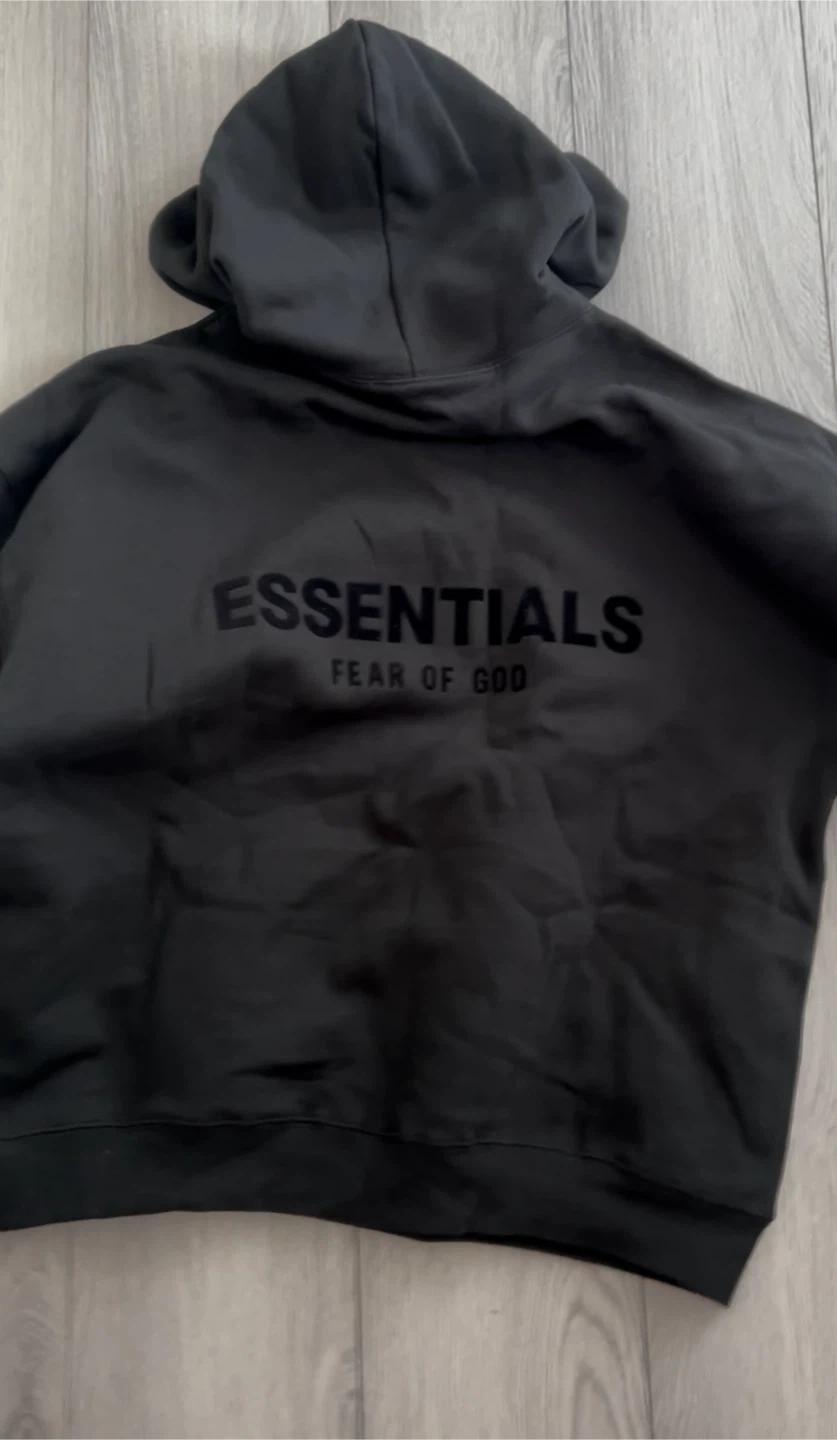 This is an Essentials Fear of God hoodie. It's a pullover style with a front pouch pocket and a hood. The "essentials" logo is printed on the back and "FEAR OF GOD" is underneath.