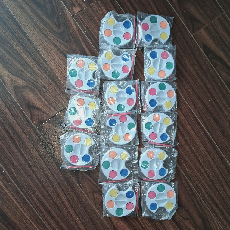 Fifteen individual mini paint palettes. Each palette features six small paint wells and includes a small brush. Ideal for crafts, painting projects, or classroom activities. Sold as a bulk lot.