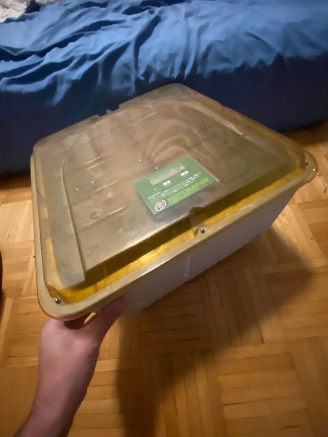 This is a used incubator box. It has a clear lid and a digital display. Power cord is included. This could be useful for hatching small batches of eggs.