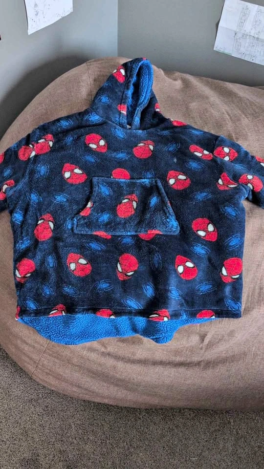 Soft fleece wearable blanket hoodie with an all-over Spider-Man print. This oversized garment is navy blue with red and white graphics and features a large front kangaroo pocket. The interior is lined with blue sherpa material for extra warmth. One size fits most design with long sleeves and an attached hood. I have 2 available. $15 each. Pick up in Crystal Ridge.