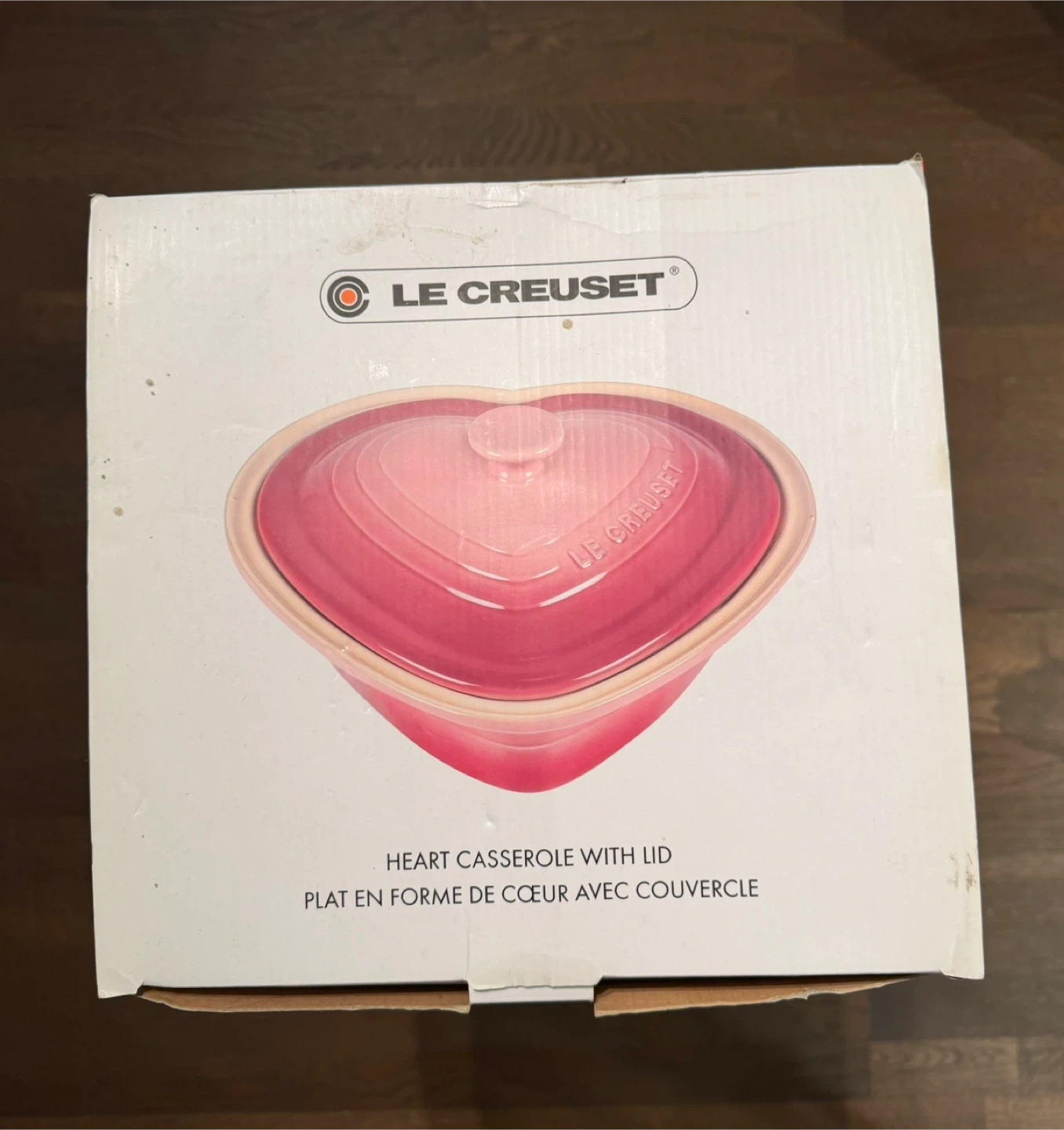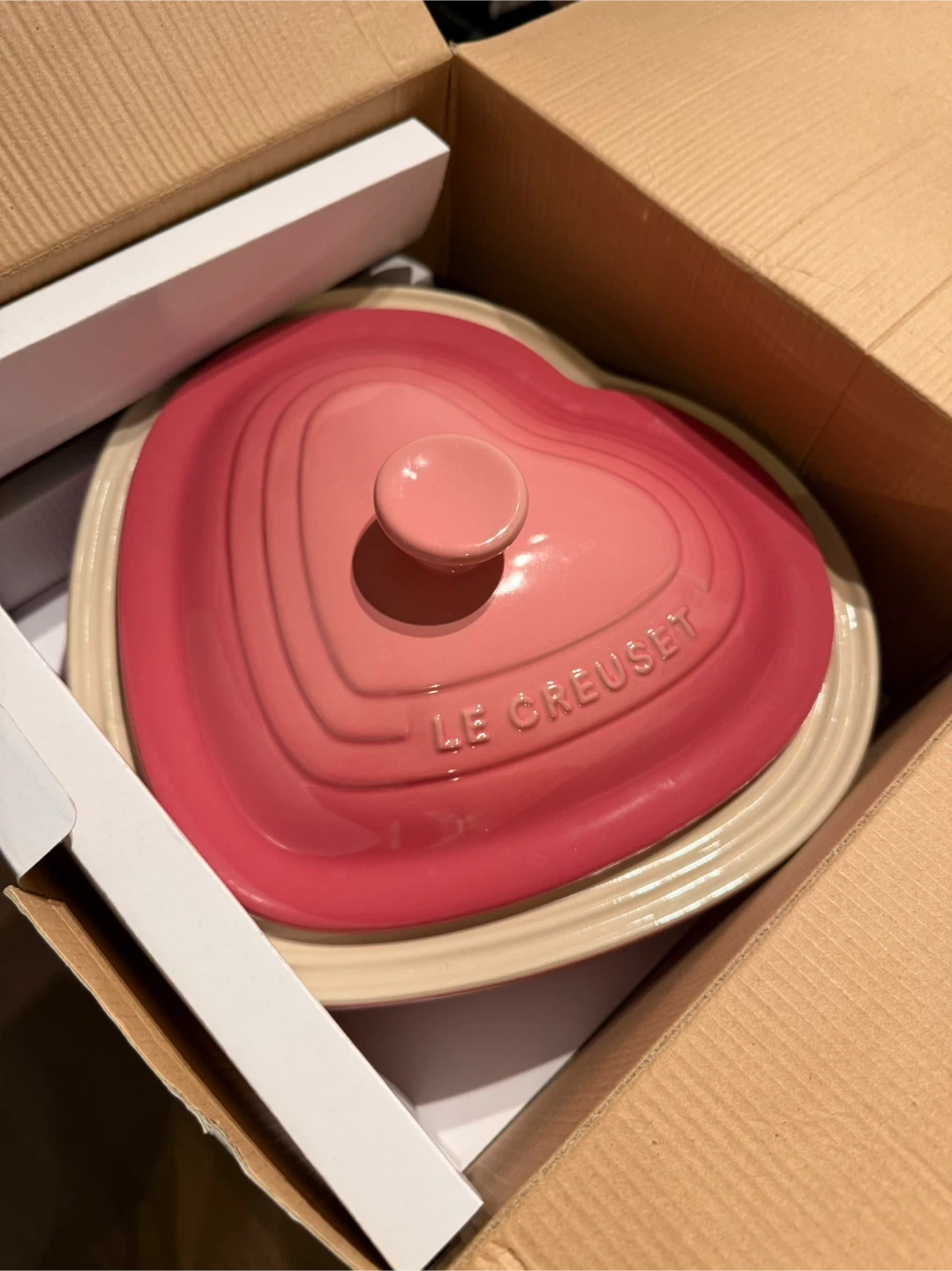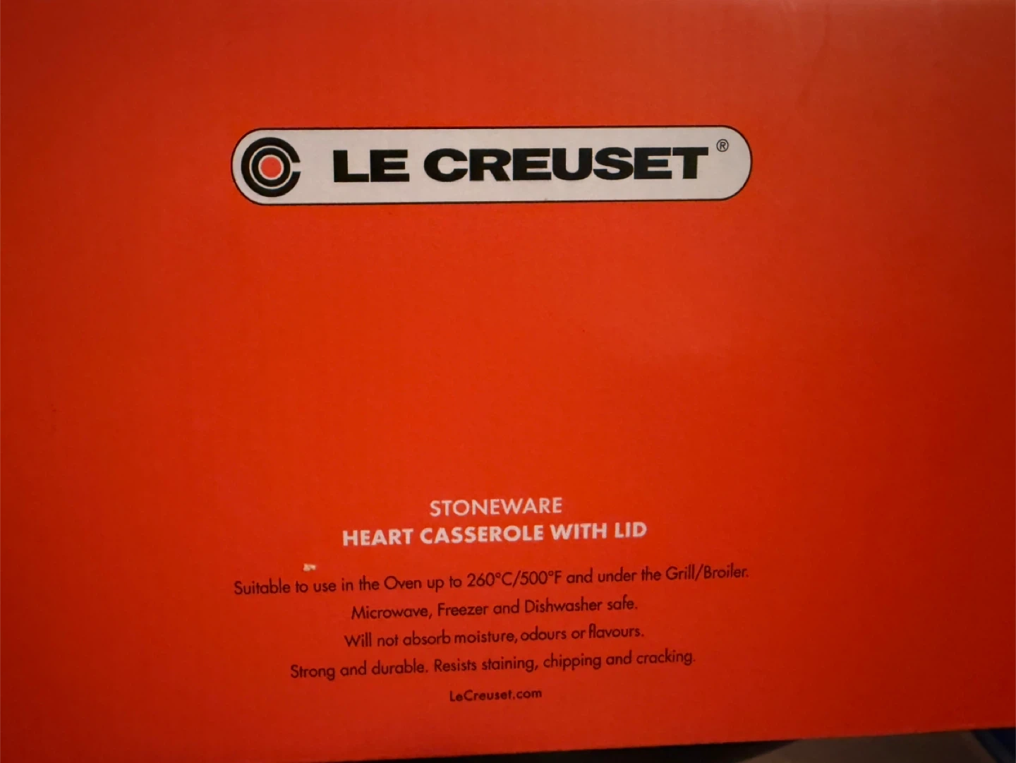 Le Creuset stoneware heart casserole with lid. Dishwasher, microwave, freezer safe and suitable for oven use up to 260°C/500°F. Resists staining, chipping, and cracking.