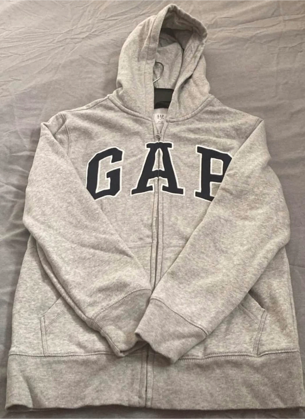 Grey Gap full zip hoodie with navy blue logo. It's a comfortable and casual sweatshirt. Made of a soft cotton blend material.