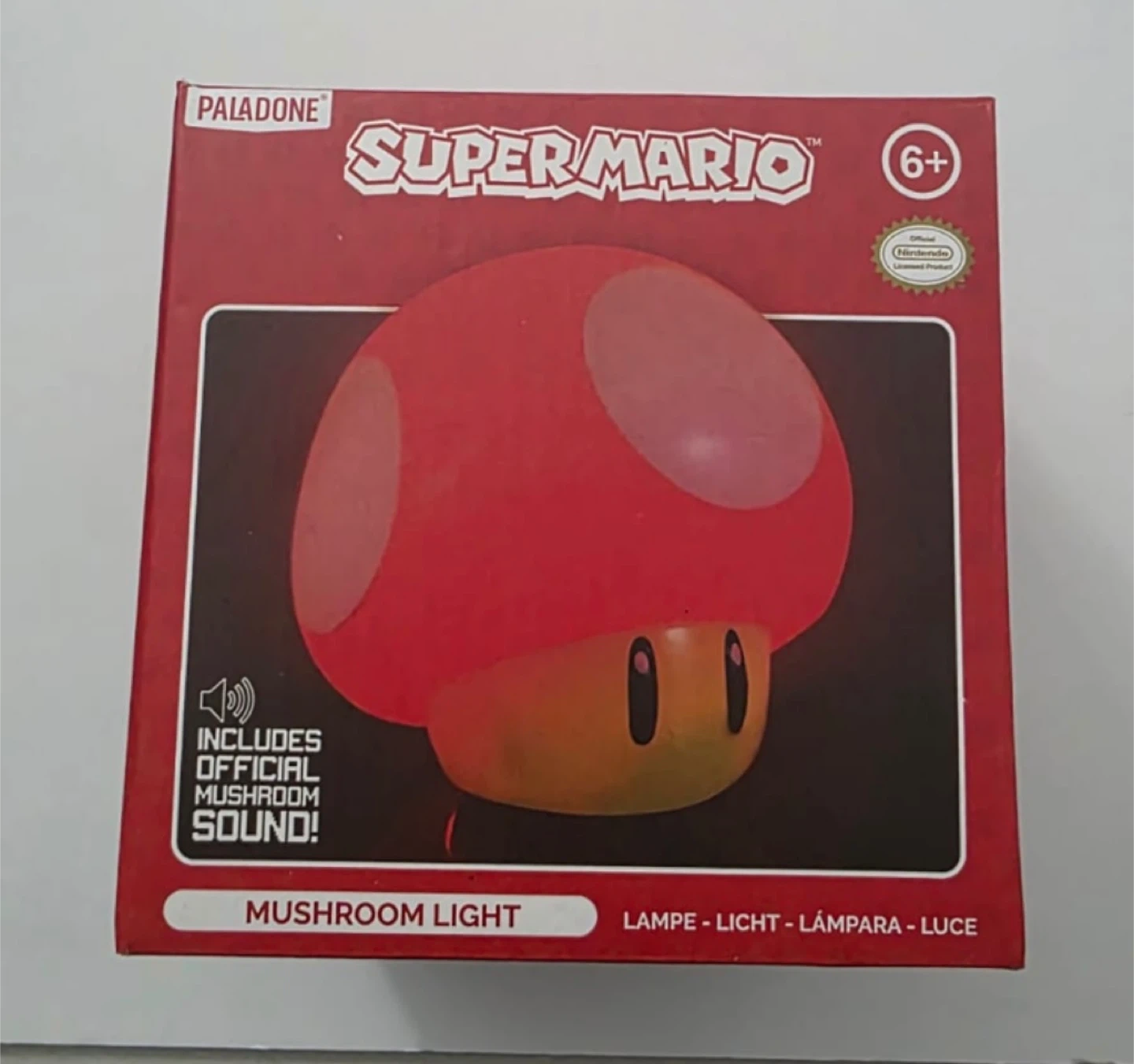 This Paladone Super Mario mushroom light is officially licensed by Nintendo. It includes the official mushroom sound! It's a great addition for any Super Mario fan's room. Recommended for ages 6 and up.