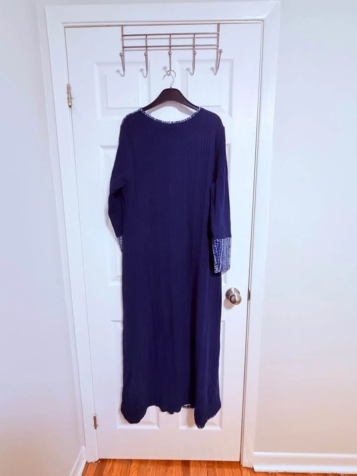 This stunning navy blue maxi dress features beautiful geometric tribal-patterned panels on the yoke, sleeves, and side. The ribbed fabric gives it a high-quality feel and a flattering drape.