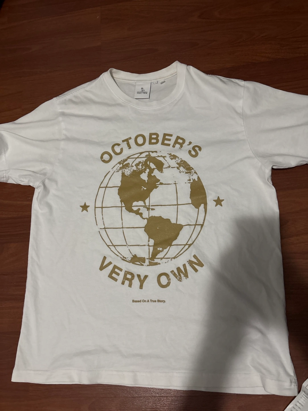 OVO white t-shirt. Features a gold globe graphic and text in great condition. (With receipt and bag). Feel free to msg me if you have questions or want to discuss the price! I am happy to communicate.
