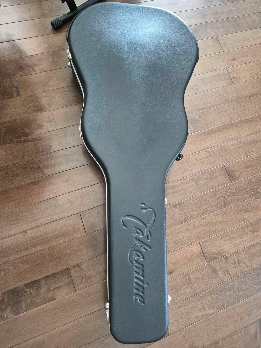This Alvarez acoustic guitar is in black with a hard case. It has a cutaway body and electronics onboard. Includes a guitar strap and a cable.