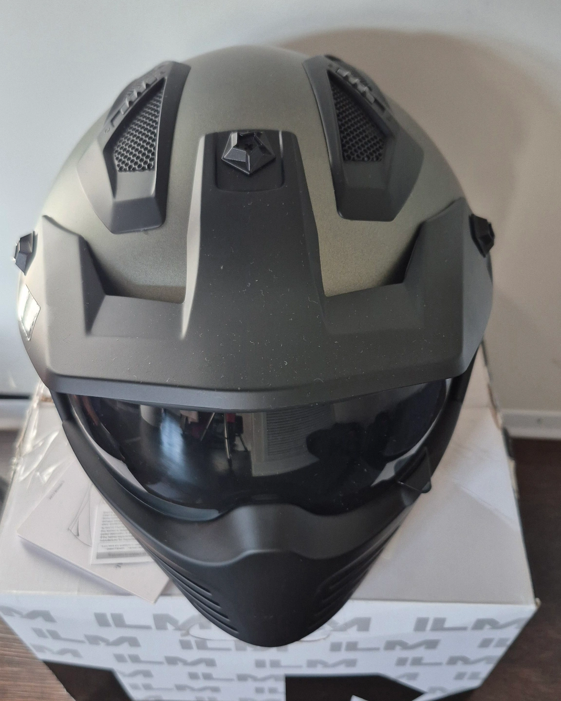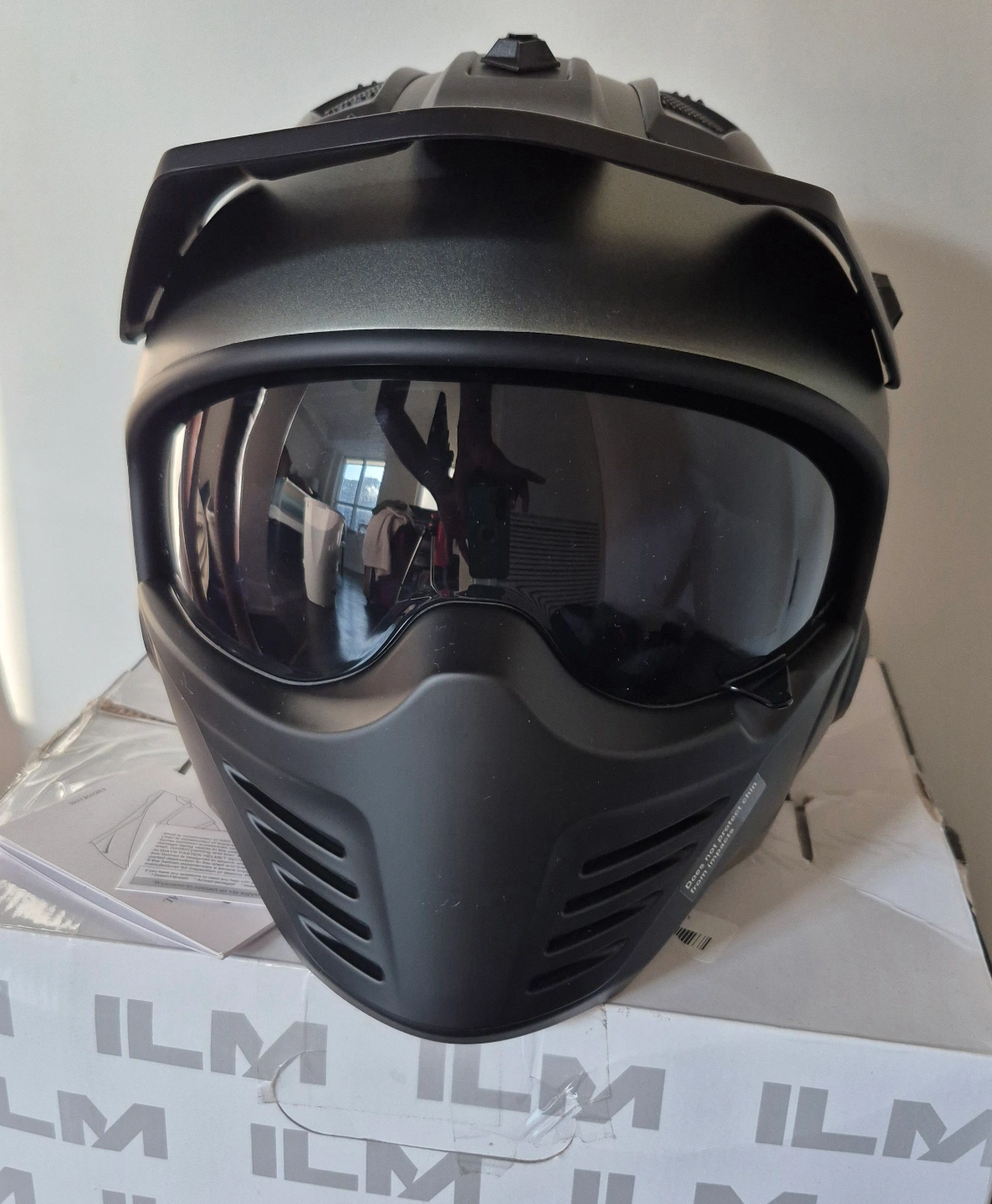17ILM brand motorcycle helmet. Size medium. Features a dark visor and chin guard. Pickup available at Sandhurst Circle Scarborough or Moyal Court Vaughan.