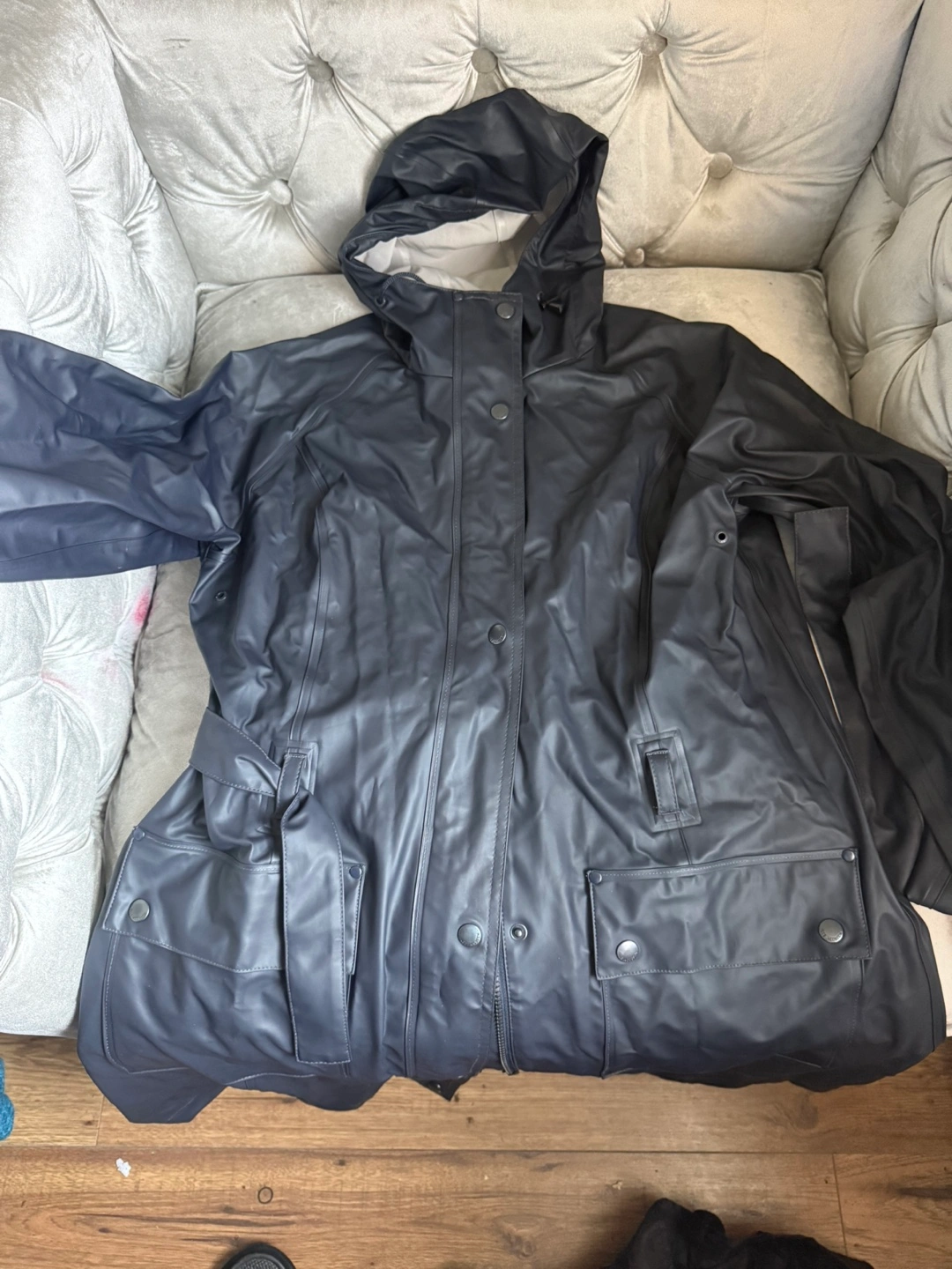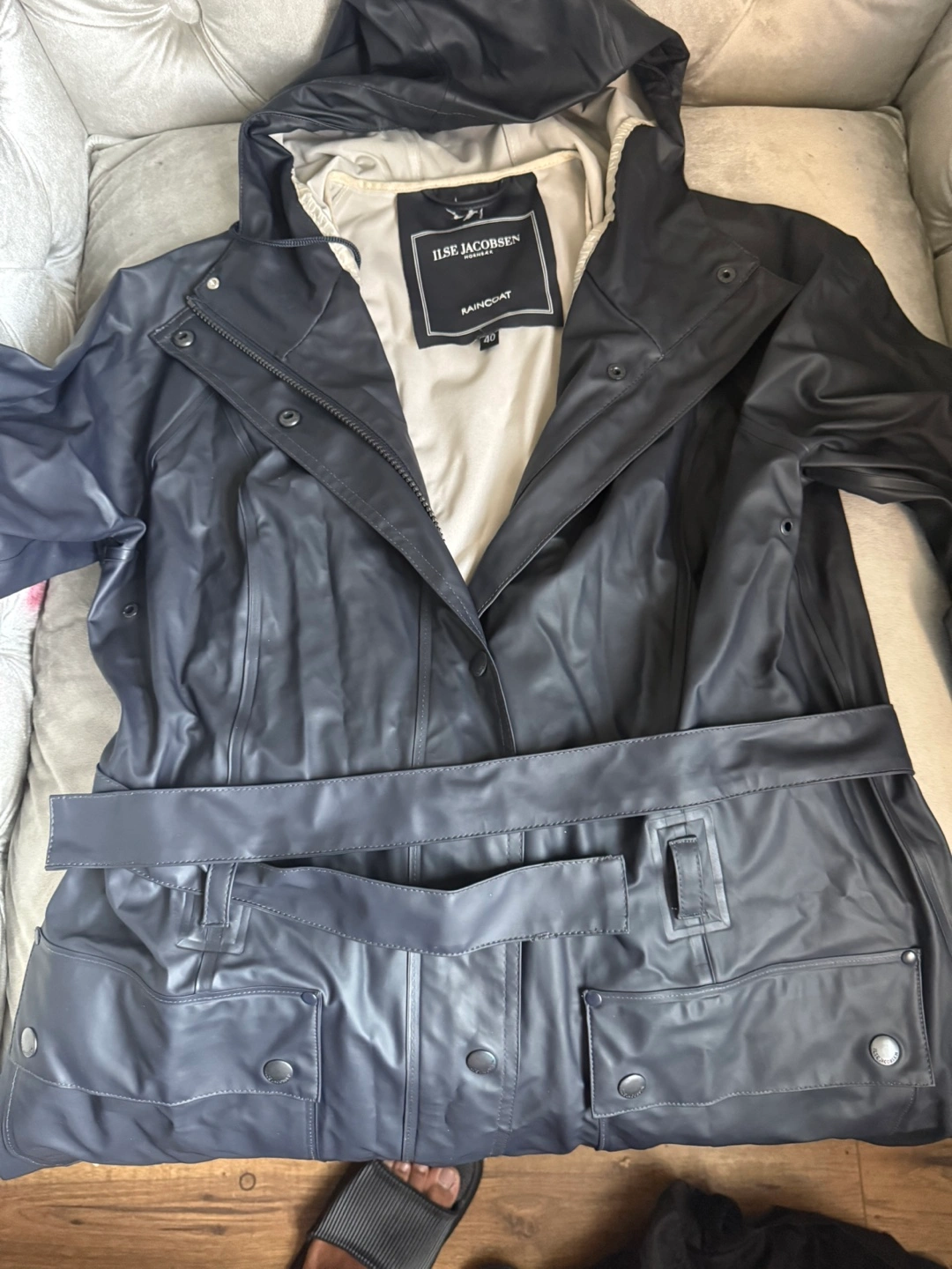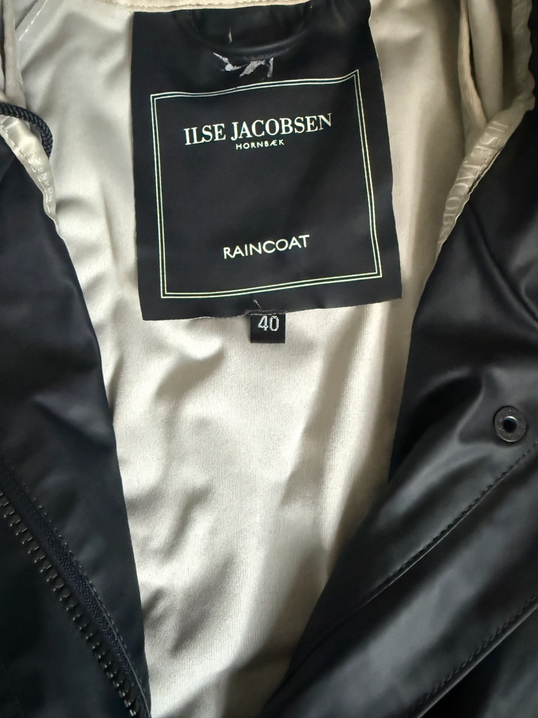Here's an Ilse Jacobsen Hornbæk raincoat in size 40. It's a stylish and functional piece, perfect for rainy days. The raincoat features a hood and a belt.