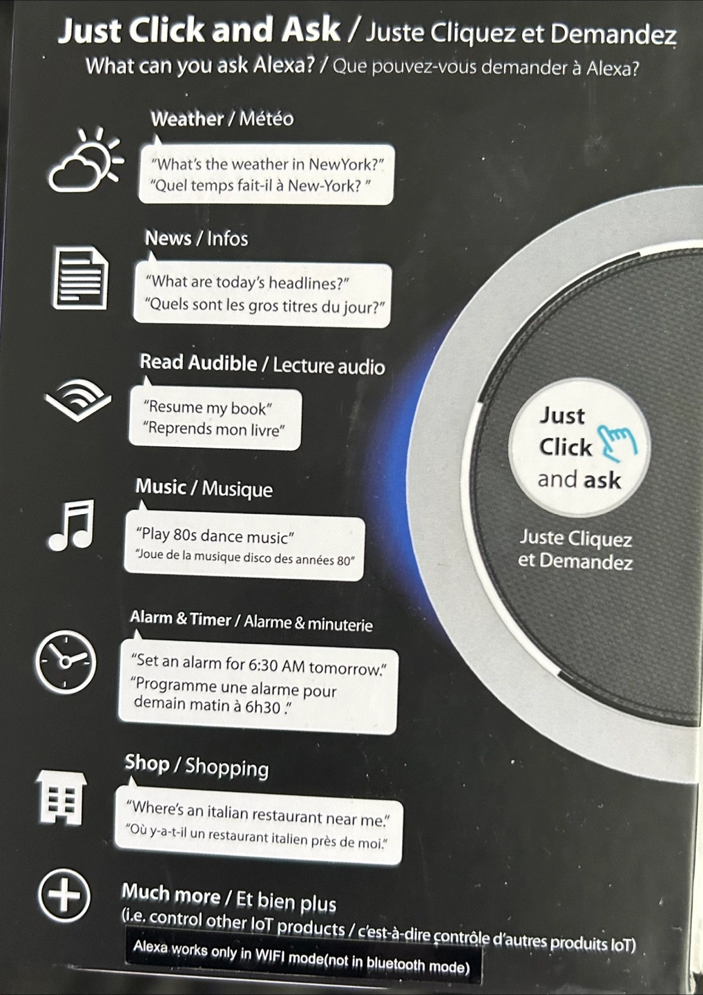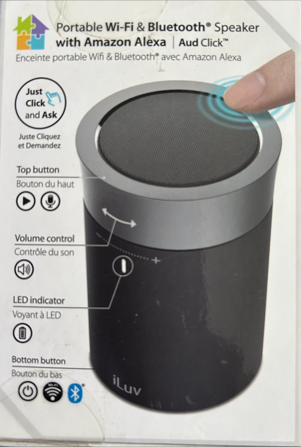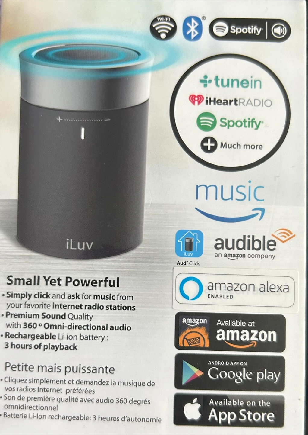 12Selling an iLuv portable speaker, Brand new. It's a Wi-Fi and Bluetooth speaker that works with Amazon Alexa. You can simply click and ask for music from your favourite internet radio stations. It also has premium sound quality with 360° omni-directional audio. It also has a rechargeable Li-ion battery with 3 hours of playback