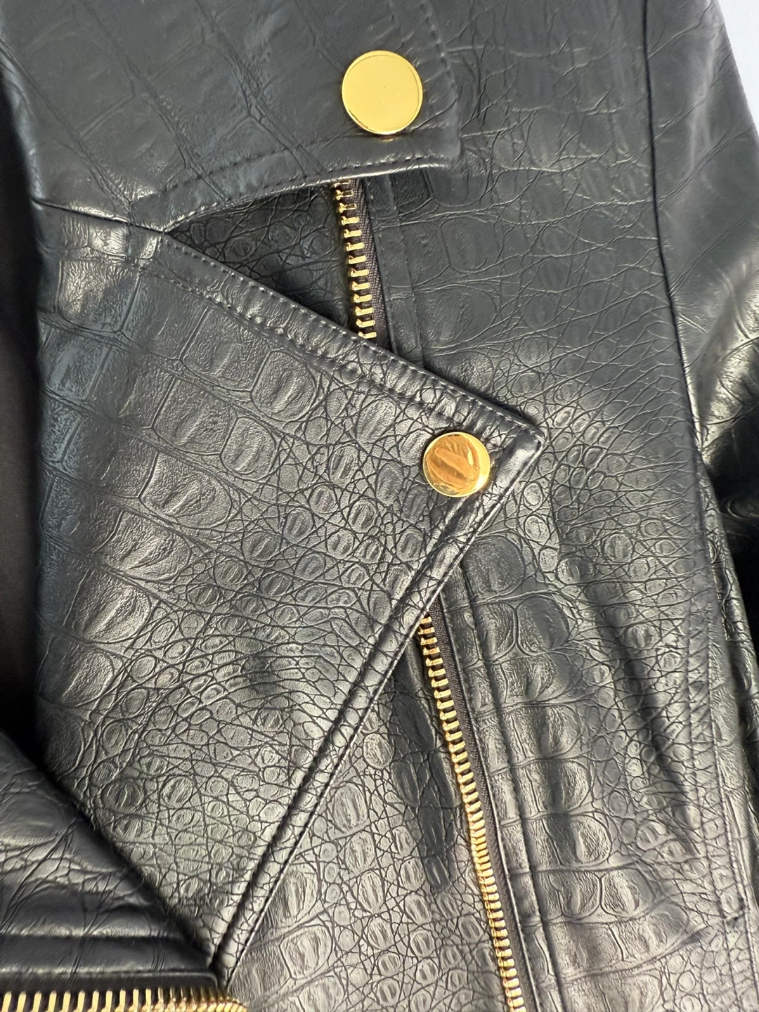Selling a stylish INC International Concepts faux leather jacket in size medium! It features a unique crocodile-like texture and eye-catching gold hardware. Perfect for adding a bit of edge to any outfit