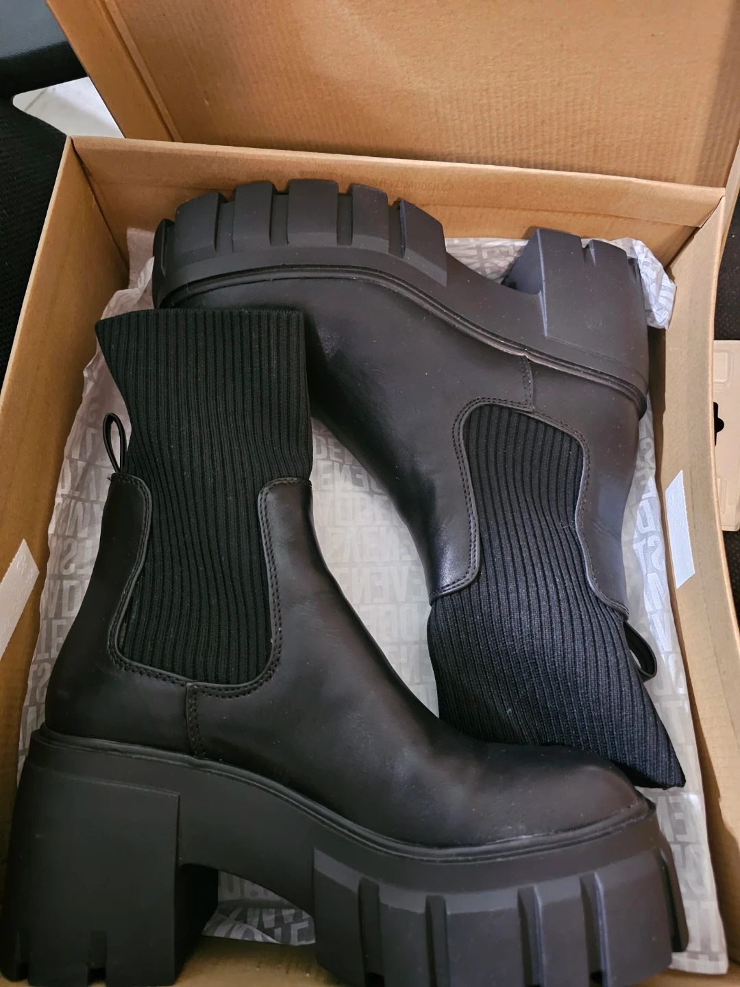 These black Steve Madden boots feature a chunky platform sole and a knit sock upper. They come in their original box. These boots are great for adding some edge to any outfit!